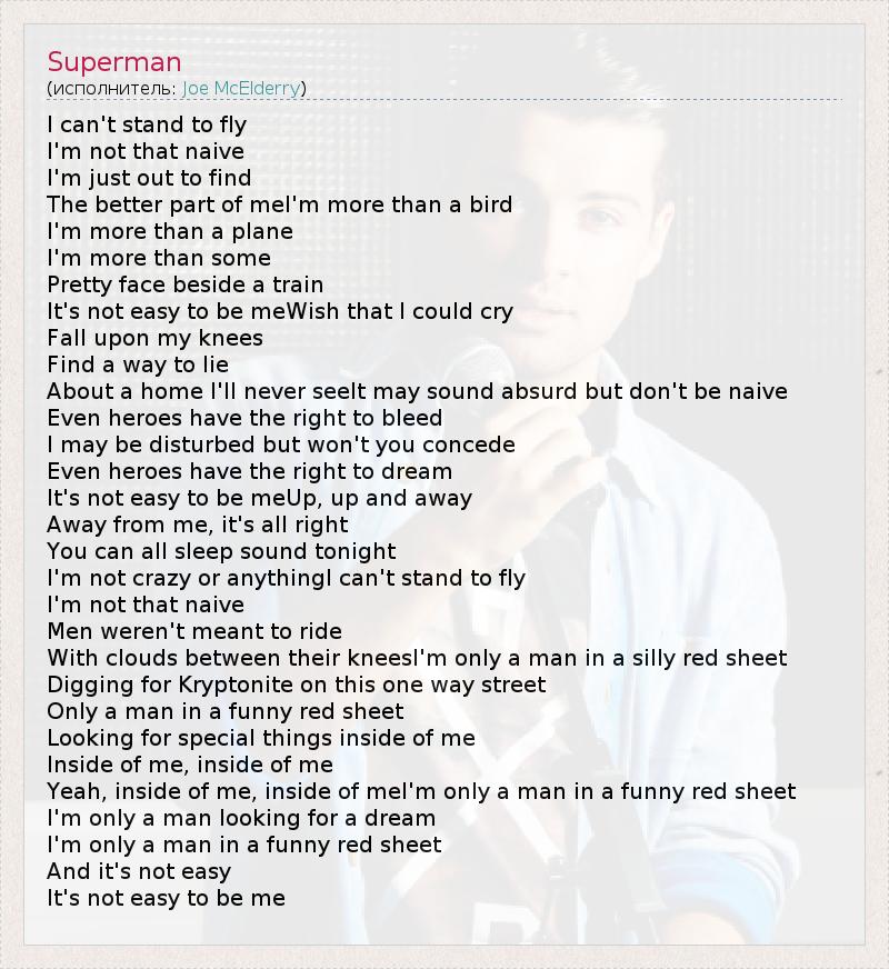 I can't stand to fly I'm not that naive I'm just out to find The better part of meI'm more than a bird I'm more than a plane I'm more than some Pretty face beside a train It's not easy to be meWish that I could cry Fall upon my knees Find a way to lie About a home I'll never seeIt may sound absurd but don't be naive Even heroes have the right to bleed I may be disturbed but won't you concede Even heroes have the right to dream It's not easy to be meUp, up and away Away from me, it's all right You can all sleep sound tonight I'm not crazy or anythingI can't stand to fly I'm not that naive Men weren't meant to ride With clouds between their kneesI'm only a man in a silly red sheet Digging for Kryptonite on this one way street Only a man in a funny red sheet Looking for special things inside of me Inside of me, inside of me Yeah, inside of me, inside of meI'm only a man in a funny red sheet I'm only a man looking for a dream I'm only a man in a funny red sheet And it's not easy It's not easy to be me