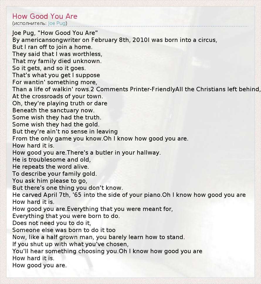 Joe Pug, "How Good You Are" By americansongwriter on February 8th, 2010I was born into a circus, But I ran off to join a home. They said that I was worthless, That my family died unknown. So it gets, and so it goes. That's what you get I suppose For wantin' something more, Than a life of walkin' rows.2 Comments Printer-FriendlyAll the Christians left behind, At the crossroads of your town. Oh, they're playing truth or dare Beneath the sanctuary now. Some wish they had the truth. Some wish they had the gold. But they're ain't no sense in leaving From the only game you know.Oh I know how good you are. How hard it is. How good you are.There's a butler in your hallway. He is troublesome and old, He repeats the word alive. To describe your family gold. You ask him please to go, But there's one thing you don't know. He carved April 7th, '65 into the side of your piano.Oh I know how good you are How hard it is. How good you are.Everything that you were meant for, Everything that you were born to do. Does not need you to do it, Someone else was born to do it too Now, like a half grown man, you barely learn how to stand. If you shut up with what you've chosen, You'll hear something choosing you.Oh I know how good you are How hard it is. How good you are.