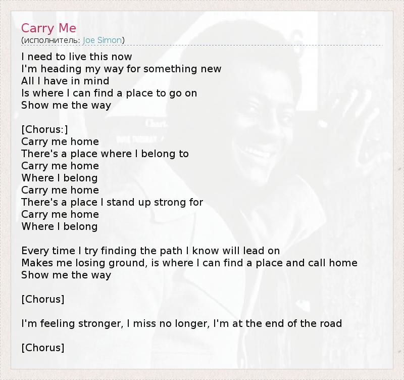 I need to live this now I'm heading my way for something new All I have in mind Is where I can find a place to go on Show me the way [Chorus:] Carry me home There's a place where I belong to Carry me home Where I belong Carry me home There's a place I stand up strong for Carry me home Where I belong Every time I try finding the path I know will lead on Makes me losing ground, is where I can find a place and call home Show me the way [Chorus] I'm feeling stronger, I miss no longer, I'm at the end of the road [Chorus]