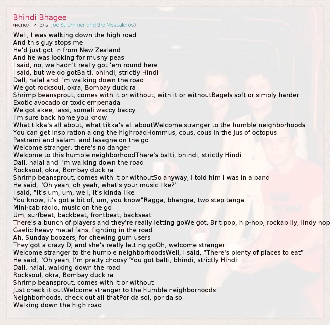 Well, I was walking down the high road And this guy stops me He'd just got in from New Zealand And he was looking for mushy peas I said, no, we hadn't really got 'em round here I said, but we do gotBalti, bhindi, strictly Hindi Dall, halal and I'm walking down the road We got rocksoul, okra, Bombay duck ra Shrimp beansprout, comes with it or without, with it or withoutBagels soft or simply harder Exotic avocado or toxic empenada We got akee, lassi, somali waccy baccy I'm sure back home you know What tikka's all about, what tikka's all aboutWelcome stranger to the humble neighborhoods You can get inspiration along the highroadHommus, cous, cous in the jus of octopus Pastrami and salami and lasagne on the go Welcome stranger, there's no danger Welcome to this humble neighborhoodThere's balti, bhindi, strictly Hindi Dall, halal and I'm walking down the road Rocksoul, okra, Bombay duck ra Shrimp beansprout, comes with it or withoutSo anyway, I told him I was in a band He said, "Oh yeah, oh yeah, what's your music like?" I said, "It's um, um, well, it's kinda like You know, it's got a bit of, um, you know"Ragga, bhangra, two step tanga Mini-cab radio, music on the go Um, surfbeat, backbeat, frontbeat, backseat There's a bunch of players and they're really letting goWe got, Brit pop, hip-hop, rockabilly, lindy hop Gaelic heavy metal fans, fighting in the road Ah, Sunday boozers, for chewing gum users They got a crazy DJ and she's really letting goOh, welcome stranger Welcome stranger to the humble neighborhoodsWell, I said, "There's plenty of places to eat" He said, "Oh yeah, I'm pretty choosy"You got balti, bhindi, strictly Hindi Dall, halal, walking down the road Rocksoul, okra, Bombay duck ra Shrimp beansprout, comes with it or without Just check it outWelcome stranger to the humble neighborhoods Neighborhoods, check out all thatPor da sol, por da sol Walking down the high road