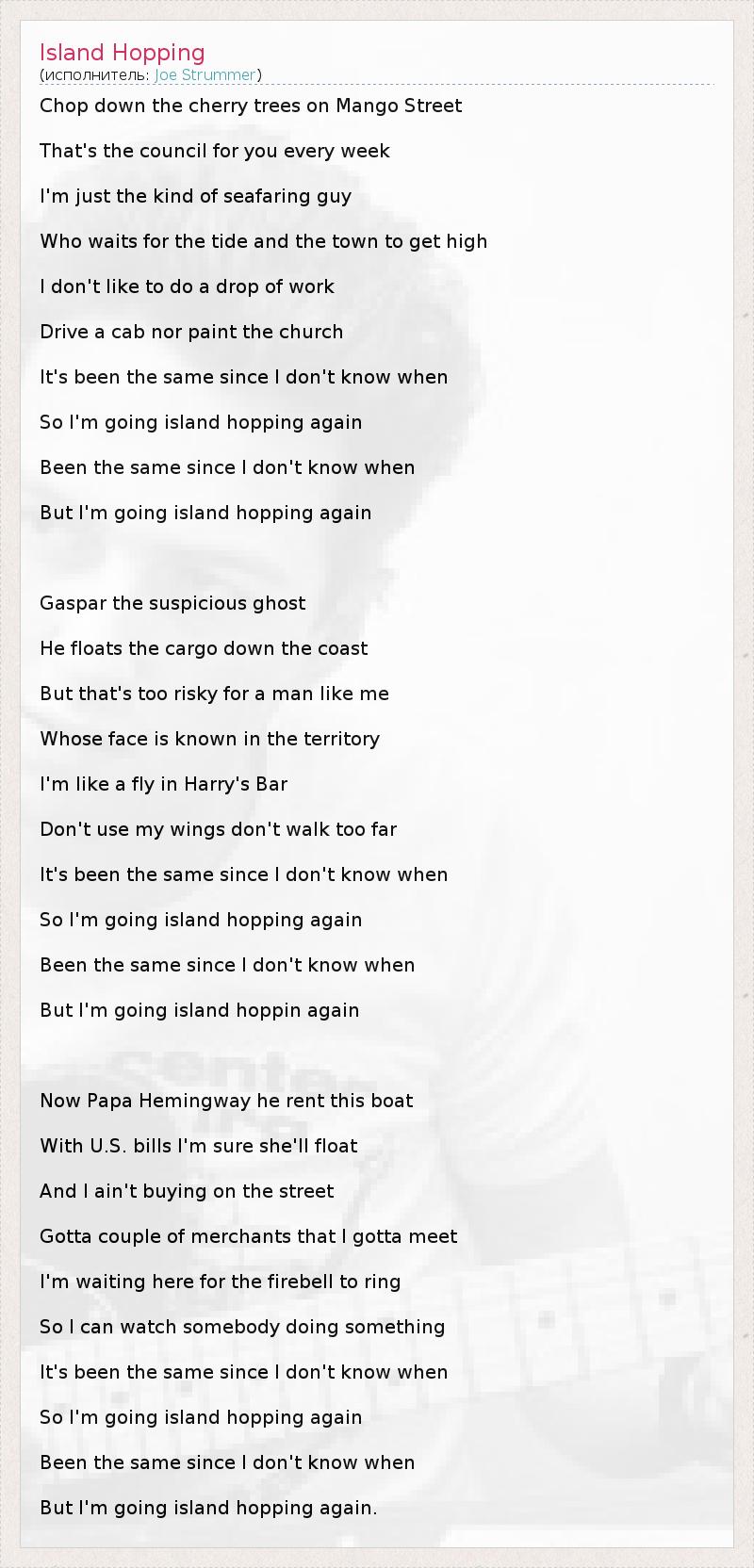 Chop down the cherry trees on Mango Street That's the council for you every week I'm just the kind of seafaring guy Who waits for the tide and the town to get high I don't like to do a drop of work Drive a cab nor paint the church It's been the same since I don't know when So I'm going island hopping again Been the same since I don't know when But I'm going island hopping again Gaspar the suspicious ghost He floats the cargo down the coast But that's too risky for a man like me Whose face is known in the territory I'm like a fly in Harry's Bar Don't use my wings don't walk too far It's been the same since I don't know when So I'm going island hopping again Been the same since I don't know when But I'm going island hoppin again Now Papa Hemingway he rent this boat With U.S. bills I'm sure she'll float And I ain't buying on the street Gotta couple of merchants that I gotta meet I'm waiting here for the firebell to ring So I can watch somebody doing something It's been the same since I don't know when So I'm going island hopping again Been the same since I don't know when But I'm going island hopping again.