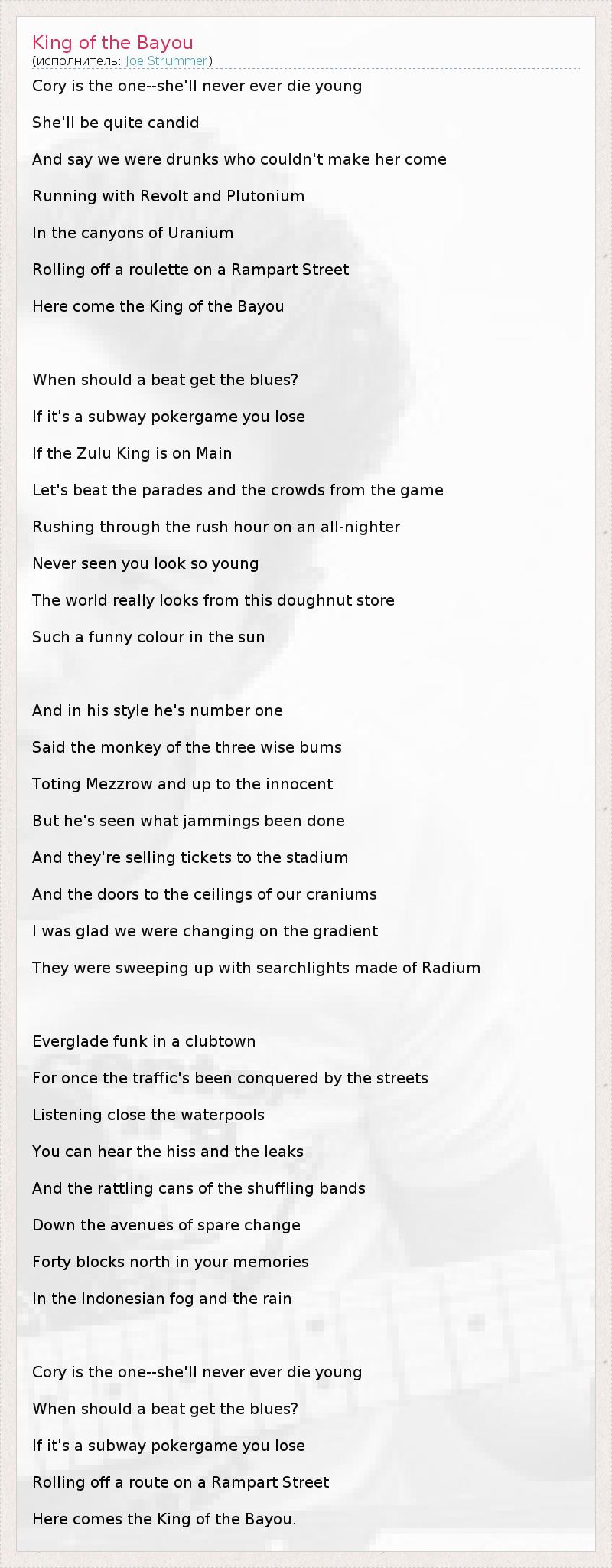 Cory is the one--she'll never ever die young She'll be quite candid And say we were drunks who couldn't make her come Running with Revolt and Plutonium In the canyons of Uranium Rolling off a roulette on a Rampart Street Here come the King of the Bayou When should a beat get the blues? If it's a subway pokergame you lose If the Zulu King is on Main Let's beat the parades and the crowds from the game Rushing through the rush hour on an all-nighter Never seen you look so young The world really looks from this doughnut store Such a funny colour in the sun And in his style he's number one Said the monkey of the three wise bums Toting Mezzrow and up to the innocent But he's seen what jammings been done And they're selling tickets to the stadium And the doors to the ceilings of our craniums I was glad we were changing on the gradient They were sweeping up with searchlights made of Radium Everglade funk in a clubtown For once the traffic's been conquered by the streets Listening close the waterpools You can hear the hiss and the leaks And the rattling cans of the shuffling bands Down the avenues of spare change Forty blocks north in your memories In the Indonesian fog and the rain Cory is the one--she'll never ever die young When should a beat get the blues? If it's a subway pokergame you lose Rolling off a route on a Rampart Street Here comes the King of the Bayou.