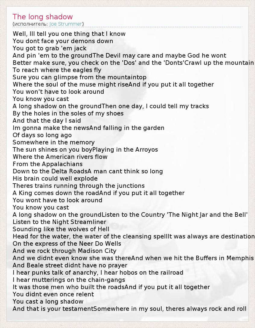 Well, Ill tell you one thing that I know You dont face your demons down You got to grab 'em jack And pin 'em to the groundThe Devil may care and maybe God he wont Better make sure, you check on the 'Dos' and the 'Donts'Crawl up the mountain To reach where the eagles fly Sure you can glimpse from the mountaintop Where the soul of the muse might riseAnd if you put it all together You won't have to look around You know you cast A long shadow on the groundThen one day, I could tell my tracks By the holes in the soles of my shoes And that the day I said Im gonna make the newsAnd falling in the garden Of days so long ago Somewhere in the memory The sun shines on you boyPlaying in the Arroyos Where the American rivers flow From the Appalachians Down to the Delta RoadsA man cant think so long His brain could well explode Theres trains running through the junctions A King comes down the roadAnd if you put it all together You wont have to look around You know you cast A long shadow on the groundListen to the Country 'The Night Jar and the Bell' Listen to the Night Streamliner Sounding like the wolves of Hell Head for the water, the water of the cleansing spellIt was always are destination On the express of the Neer Do Wells And we rock through Madison City And we didnt even know she was thereAnd when we hit the Buffers in Memphis And Beale street didnt have no prayer I hear punks talk of anarchy, I hear hobos on the railroad I hear mutterings on the chain-gangs It was those men who built the roadsAnd if you put it all together You didnt even once relent You cast a long shadow And that is your testamentSomewhere in my soul, theres always rock and roll