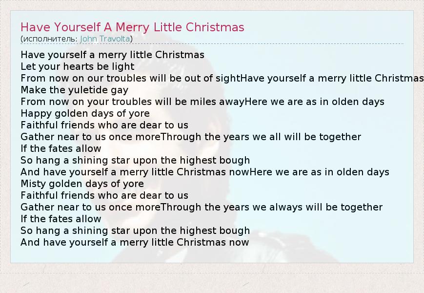 Have yourself a merry little Christmas Let your hearts be light From now on our troubles will be out of sightHave yourself a merry little Christmas Make the yuletide gay From now on your troubles will be miles awayHere we are as in olden days Happy golden days of yore Faithful friends who are dear to us Gather near to us once moreThrough the years we all will be together If the fates allow So hang a shining star upon the highest bough And have yourself a merry little Christmas nowHere we are as in olden days Misty golden days of yore Faithful friends who are dear to us Gather near to us once moreThrough the years we always will be together If the fates allow So hang a shining star upon the highest bough And have yourself a merry little Christmas now
