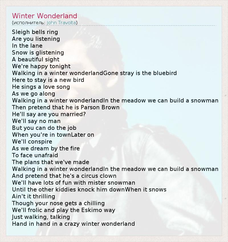 Sleigh bells ring Are you listening In the lane Snow is glistening A beautiful sight We're happy tonight Walking in a winter wonderlandGone stray is the bluebird Here to stay is a new bird He sings a love song As we go along Walking in a winter wonderlandIn the meadow we can build a snowman Then pretend that he is Parson Brown He'll say are you married? We'll say no man But you can do the job When you're in townLater on We'll conspire As we dream by the fire To face unafraid The plans that we've made Walking in a winter wonderlandIn the meadow we can build a snowman And pretend that he's a circus clown We'll have lots of fun with mister snowman Until the other kiddies knock him downWhen it snows Ain't it thrilling Though your nose gets a chilling We'll frolic and play the Eskimo way Just walking, talking Hand in hand in a crazy winter wonderland