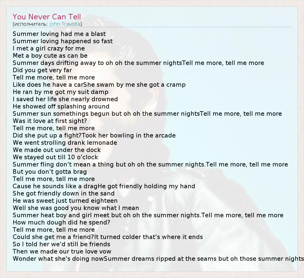 Summer loving had me a blast Summer loving happened so fast I met a girl crazy for me Met a boy cute as can be Summer days drifting away to oh oh the summer nightsTell me more, tell me more Did you get very far Tell me more, tell me more Like does he have a carShe swam by me she got a cramp He ran by me got my suit damp I saved her life she nearly drowned He showed off splashing around Summer sun somethings begun but oh oh the summer nightsTell me more, tell me more Was it love at first sight? Tell me more, tell me more Did she put up a fight?Took her bowling in the arcade We went strolling drank lemonade We made out under the dock We stayed out till 10 o'clock Summer fling don't mean a thing but oh oh the summer nights.Tell me more, tell me more But you don't gotta brag Tell me more, tell me more Cause he sounds like a dragHe got friendly holding my hand She got friendly down in the sand He was sweet just turned eighteen Well she was good you know what I mean Summer heat boy and girl meet but oh oh the summer nights.Tell me more, tell me more How much dough did he spend? Tell me more, tell me more Could she get me a friend?It turned colder that's where it ends So I told her we'd still be friends Then we made our true love vow Wonder what she's doing nowSummer dreams ripped at the seams but oh those summer nights