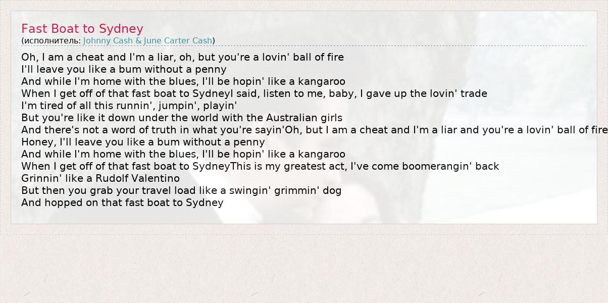 Oh, I am a cheat and I'm a liar, oh, but you're a lovin' ball of fire I'll leave you like a bum without a penny And while I'm home with the blues, I'll be hopin' like a kangaroo When I get off of that fast boat to SydneyI said, listen to me, baby, I gave up the lovin' trade I'm tired of all this runnin', jumpin', playin' But you're like it down under the world with the Australian girls And there's not a word of truth in what you're sayin'Oh, but I am a cheat and I'm a liar and you're a lovin' ball of fire Honey, I'll leave you like a bum without a penny And while I'm home with the blues, I'll be hopin' like a kangaroo When I get off of that fast boat to SydneyThis is my greatest act, I've come boomerangin' back Grinnin' like a Rudolf Valentino But then you grab your travel load like a swingin' grimmin' dog And hopped on that fast boat to Sydney