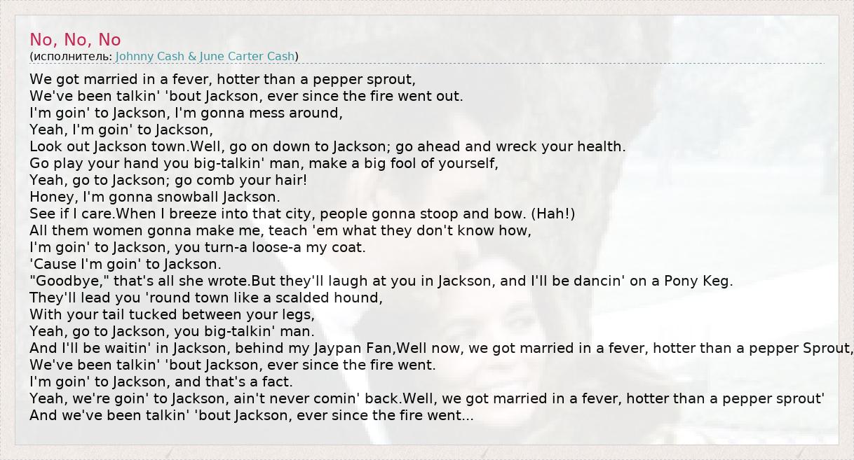 Yeah, we're goin' to Jackson, ain't never comin' back.Well, we got married in a fever, hotter than a pepper sprout'