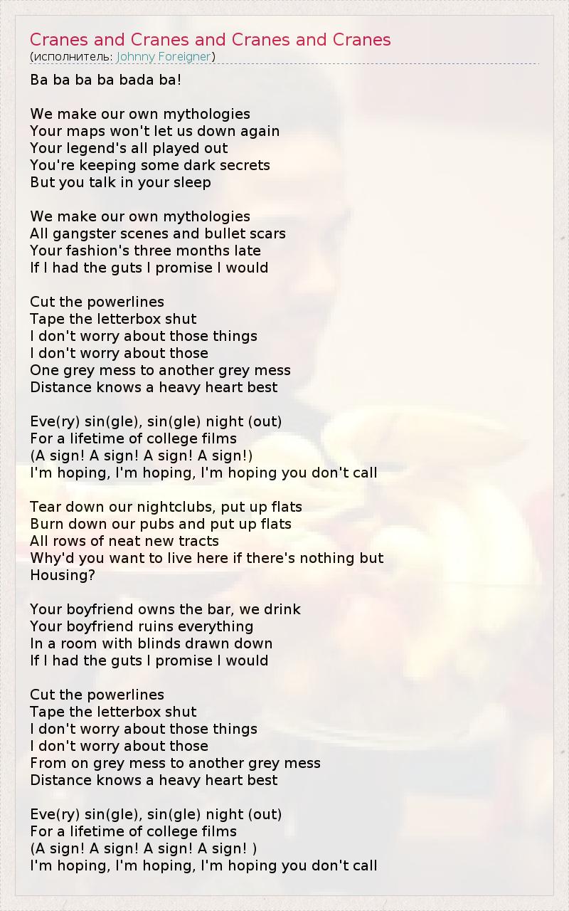 Ba ba ba ba bada ba! We make our own mythologies Your maps won't let us down again Your legend's all played out You're keeping some dark secrets But you talk in your sleep We make our own mythologies All gangster scenes and bullet scars Your fashion's three months late If I had the guts I promise I would Cut the powerlines Tape the letterbox shut I don't worry about those things I don't worry about those One grey mess to another grey mess Distance knows a heavy heart best Eve(ry) sin(gle), sin(gle) night (out) For a lifetime of college films (A sign! A sign! A sign! A sign!) I'm hoping, I'm hoping, I'm hoping you don't call Tear down our nightclubs, put up flats Burn down our pubs and put up flats All rows of neat new tracts Why'd you want to live here if there's nothing but Housing? Your boyfriend owns the bar, we drink Your boyfriend ruins everything In a room with blinds drawn down If I had the guts I promise I would Cut the powerlines Tape the letterbox shut I don't worry about those things I don't worry about those From on grey mess to another grey mess Distance knows a heavy heart best Eve(ry) sin(gle), sin(gle) night (out) For a lifetime of college films (A sign! A sign! A sign! A sign! ) I'm hoping, I'm hoping, I'm hoping you don't call
