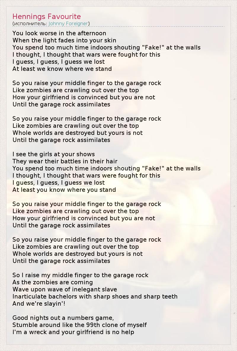 You look worse in the afternoon When the light fades into your skin You spend too much time indoors shouting "Fake!" at the walls I thought, I thought that wars were fought for this I guess, I guess, I guess we lost At least we know where we stand So you raise your middle finger to the garage rock Like zombies are crawling out over the top How your girlfriend is convinced but you are not Until the garage rock assimilates So you raise your middle finger to the garage rock Like zombies are crawling out over the top Whole worlds are destroyed but yours is not Until the garage rock assimilates I see the girls at your shows They wear their battles in their hair You spend too much time indoors shouting "Fake!" at the walls I thought, I thought that wars were fought for this I guess, I guess, I guess we lost At least you know where you stand So you raise your middle finger to the garage rock Like zombies are crawling out over the top How your girlfriend is convinced but you are not Until the garage rock assimilates So you raise your middle finger to the garage rock Like zombies are crawling out over the top Whole worlds are destroyed but yours is not Until the garage rock assimilates So I raise my middle finger to the garage rock As the zombies are coming Wave upon wave of inelegant slave Inarticulate bachelors with sharp shoes and sharp teeth And we're slayin'! Good nights out a numbers game, Stumble around like the 99th clone of myself I'm a wreck and your girlfriend is no help