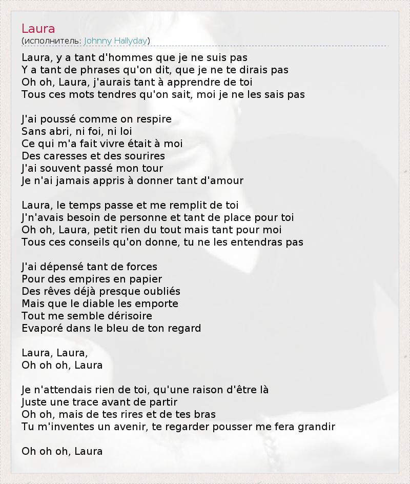 Лора, в мире столько мужчин, ни одним из которых я не являюсь, Столько фраз произносится, которых я бы тебе не сказал. О, о, Лора, я мог бы стремиться узнать еще больше о тебе. Все эти нежные слова, известны каждому, но неведомы мне. Я шел вперед, ведомый дыханием, Без крова, без веры, против закона. То, что заставляло меня жить, принадлежало мне - Ласки и улыбки. Я часто пропускал свою очередь. Я так и не научился дарить свою любовь. Лора, время бежит и наполняет меня тобой. Мне не нужен был никто и у меня столько места для тебя. О, о, Лора, мелочи ничего не значат, но так важны для меня. Все эти советы, ты их не услышишь. Я растратил столько сил На бумажные империи, Мечты уже почти позабыты, Но пусть катятся куда подальше! Все мне кажется смешным, Испарившимся в синеве твоего взгляда. Лора, Лора, О, о, о, Лора... Я ничего не ждал от тебя, кроме твоего присутствия здесь, Всего лишь следа, прежде чем уйдешь. О, о, своим смехом и объятьями Ты отрываешь мое будущее; я смотрю, как ты даешь мне силы. О, о, о, Лора...