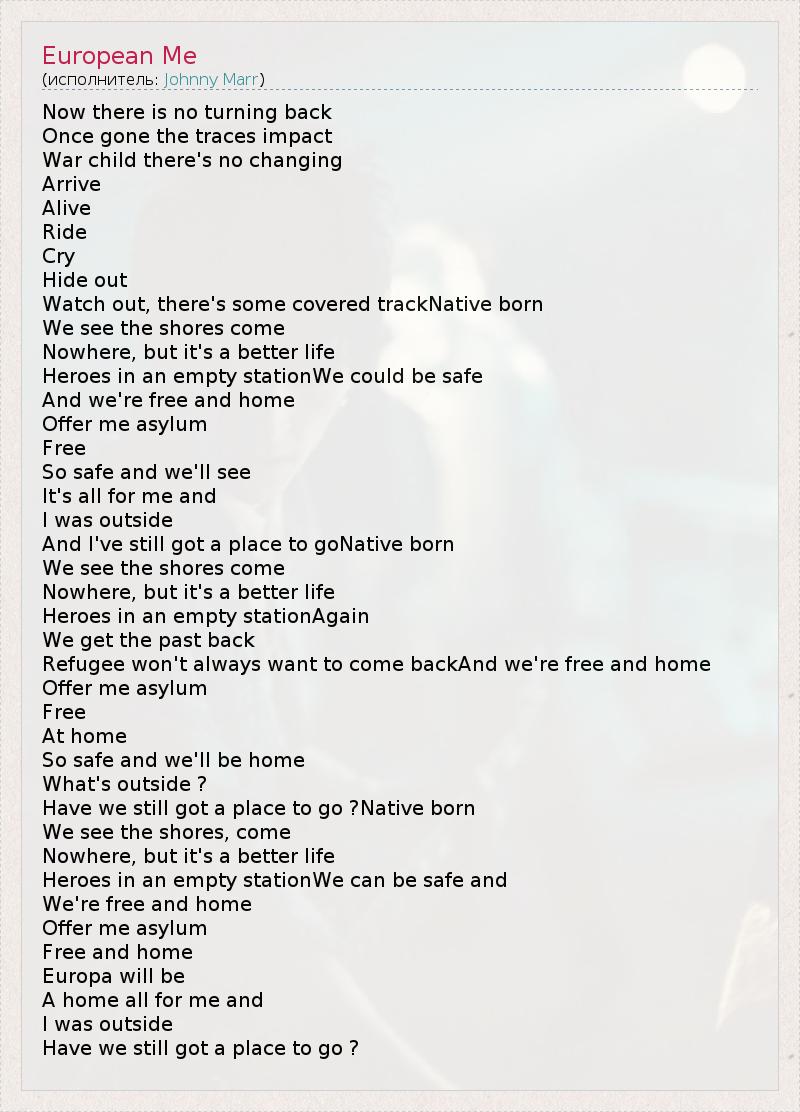 Now there is no turning back Once gone the traces impact War child there's no changing Arrive Alive Ride Cry Hide out Watch out, there's some covered trackNative born We see the shores come Nowhere, but it's a better life Heroes in an empty stationWe could be safe And we're free and home Offer me asylum Free So safe and we'll see It's all for me and I was outside And I've still got a place to goNative born We see the shores come Nowhere, but it's a better life Heroes in an empty stationAgain We get the past back Refugee won't always want to come backAnd we're free and home Offer me asylum Free At home So safe and we'll be home What's outside ? Have we still got a place to go ?Native born We see the shores, come Nowhere, but it's a better life Heroes in an empty stationWe can be safe and We're free and home Offer me asylum Free and home Europa will be A home all for me and I was outside Have we still got a place to go ?