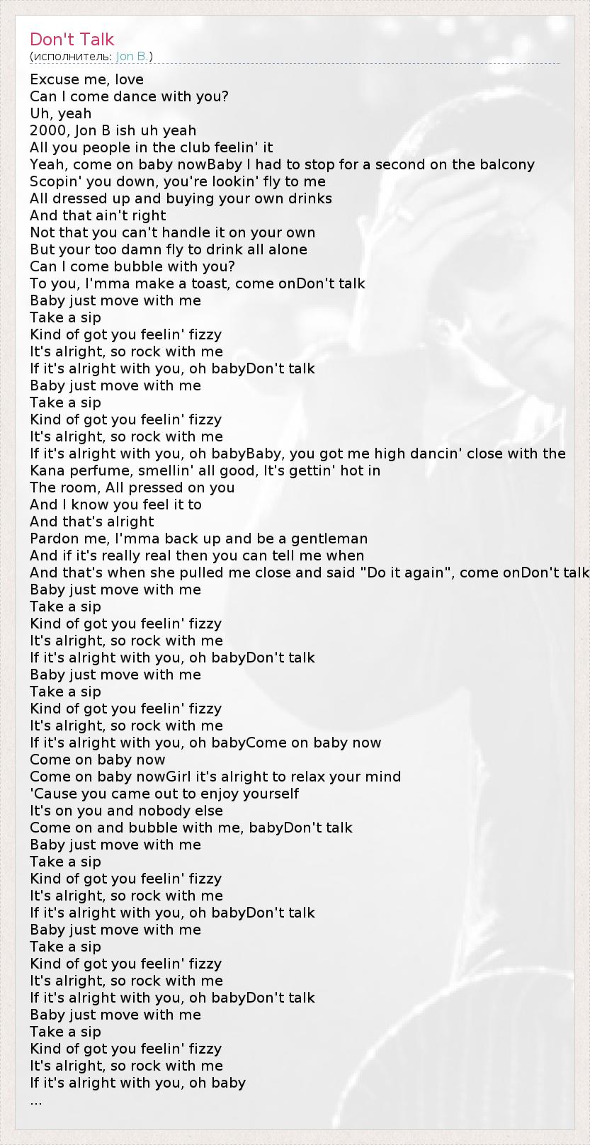 Excuse me, love Can I come dance with you? Uh, yeah 2000, Jon B ish uh yeah All you people in the club feelin' it Yeah, come on baby nowBaby I had to stop for a second on the balcony Scopin' you down, you're lookin' fly to me All dressed up and buying your own drinks And that ain't right Not that you can't handle it on your own But your too damn fly to drink all alone Can I come bubble with you? To you, I'mma make a toast, come onDon't talk Baby just move with me Take a sip Kind of got you feelin' fizzy It's alright, so rock with me If it's alright with you, oh babyDon't talk Baby just move with me Take a sip Kind of got you feelin' fizzy It's alright, so rock with me If it's alright with you, oh babyBaby, you got me high dancin' close with the Kana perfume, smellin' all good, It's gettin' hot in The room, All pressed on you And I know you feel it to And that's alright Pardon me, I'mma back up and be a gentleman And if it's really real then you can tell me when And that's when she pulled me close and said "Do it again", come onDon't talk Baby just move with me Take a sip Kind of got you feelin' fizzy It's alright, so rock with me If it's alright with you, oh babyDon't talk Baby just move with me Take a sip Kind of got you feelin' fizzy It's alright, so rock with me If it's alright with you, oh babyCome on baby now Come on baby now Come on baby nowGirl it's alright to relax your mind 'Cause you came out to enjoy yourself It's on you and nobody else Come on and bubble with me, babyDon't talk Baby just move with me Take a sip Kind of got you feelin' fizzy It's alright, so rock with me If it's alright with you, oh babyDon't talk Baby just move with me Take a sip Kind of got you feelin' fizzy It's alright, so rock with me If it's alright with you, oh babyDon't talk Baby just move with me Take a sip Kind of got you feelin' fizzy It's alright, so rock with me If it's alright with you, oh baby ...