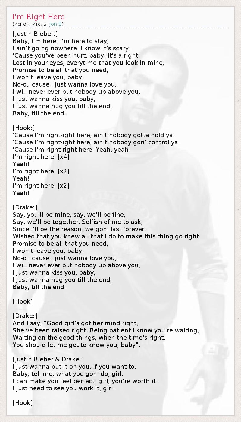 [Justin Bieber:] Baby, I'm here, I'm here to stay, I ain't going nowhere. I know it's scary 'Cause you've been hurt, baby, it's alright. Lost in your eyes, everytime that you look in mine, Promise to be all that you need, I won't leave you, baby. No-o, 'cause I just wanna love you, I will never ever put nobody up above you, I just wanna kiss you, baby, I just wanna hug you till the end, Baby, till the end. [Hook:] 'Cause I'm right-ight here, ain't nobody gotta hold ya. 'Cause I'm right-ight here, ain't nobody gon' control ya. 'Cause I'm right right here. Yeah, yeah! I'm right here. [x4] Yeah! I'm right here. [x2] Yeah! I'm right here. [x2] Yeah! [Drake:] Say, you'll be mine, say, we'll be fine, Say, we'll be together. Selfish of me to ask, Since I'll be the reason, we gon' last forever. Wished that you knew all that I do to make this thing go right. Promise to be all that you need, I won't leave you, baby. No-o, 'cause I just wanna love you, I will never ever put nobody up above you, I just wanna kiss you, baby, I just wanna hug you till the end, Baby, till the end. [Hook] [Drake:] And I say, "Good girl's got her mind right, She've been raised right. Being patient I know you're waiting, Waiting on the good things, when the time's right. You should let me get to know you, baby". [Justin Bieber & Drake:] I just wanna put it on you, if you want to. Baby, tell me, what you gon' do, girl. I can make you feel perfect, girl, you're worth it. I just need to see you work it, girl. [Hook]