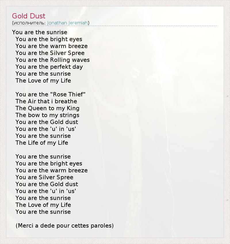 You are the sunrise You are the bright eyes You are the warm breeze You are the Silver Spree You are the Rolling waves You are the perfekt day You are the sunrise The Love of my Life You are the "Rose Thief" The Air that i breathe The Queen to my King The bow to my strings You are the Gold dust You are the 'u' in 'us' You are the sunrise The Life of my Life You are the sunrise You are the bright eyes You are the warm breeze You are Silver Spree You are the Gold dust You are the 'u' in 'us' You are the sunrise The Love of my Life You are the sunrise (Merci a dede pour cettes paroles)