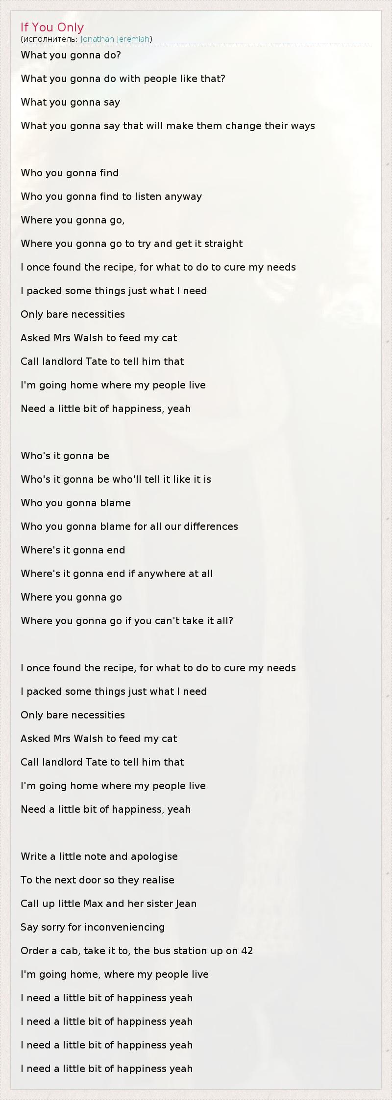 What you gonna do? What you gonna do with people like that? What you gonna say What you gonna say that will make them change their ways Who you gonna find Who you gonna find to listen anyway Where you gonna go, Where you gonna go to try and get it straight I once found the recipe, for what to do to cure my needs I packed some things just what I need Only bare necessities Asked Mrs Walsh to feed my cat Call landlord Tate to tell him that I'm going home where my people live Need a little bit of happiness, yeah Who's it gonna be Who's it gonna be who'll tell it like it is Who you gonna blame Who you gonna blame for all our differences Where's it gonna end Where's it gonna end if anywhere at all Where you gonna go Where you gonna go if you can't take it all? I once found the recipe, for what to do to cure my needs I packed some things just what I need Only bare necessities Asked Mrs Walsh to feed my cat Call landlord Tate to tell him that I'm going home where my people live Need a little bit of happiness, yeah Write a little note and apologise To the next door so they realise Call up little Max and her sister Jean Say sorry for inconveniencing Order a cab, take it to, the bus station up on 42 I'm going home, where my people live I need a little bit of happiness yeah I need a little bit of happiness yeah I need a little bit of happiness yeah I need a little bit of happiness yeah