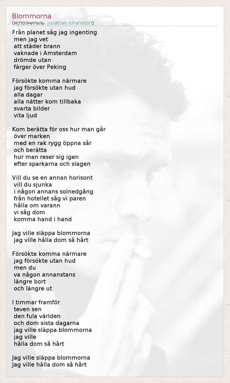 Från planet såg jag ingenting men jag vet att städer brann vaknade i Amsterdam drömde utan färger över Peking Försökte komma närmare jag försökte utan hud alla dagar alla nätter kom tillbaka svarta bilder vita ljud Kom berätta för oss hur man går över marken med en rak rygg öppna sår och berätta hur man reser sig igen efter sparkarna och slagen Vill du se en annan horisont vill du sjunka i någon annans solnedgång från hotellet såg vi paren hålla om varann vi såg dom komma hand i hand Jag ville släppa blommorna jag ville hålla dom så hårt Försökte komma närmare jag försökte utan hud men du va någon annanstans längre bort och längre ut I timmar framför teven sen den fula världen och dom sista dagarna jag ville släppa blommorna jag ville hålla dom så hårt Jag ville släppa blommorna Jag ville hålla dom så hårt