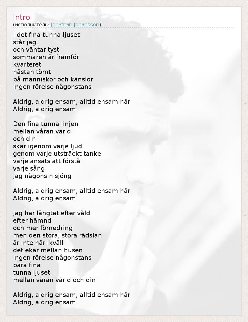 Это интересно:Jonathan Johansson, born August 29, 1980, is a Swedish musician and singer-songwriter from Malmö. He is currently on Hybris Records.Pitchfork describes his music as containing "the bruised emotionalism and chilly synthcraft of his Swedish language debut, En hand i himlen (which translates roughly to "A Hand in the Sky")."His single "Aldrig Ensam" was remixed by the Swedish electronic act Boeoes Kaelstigen.