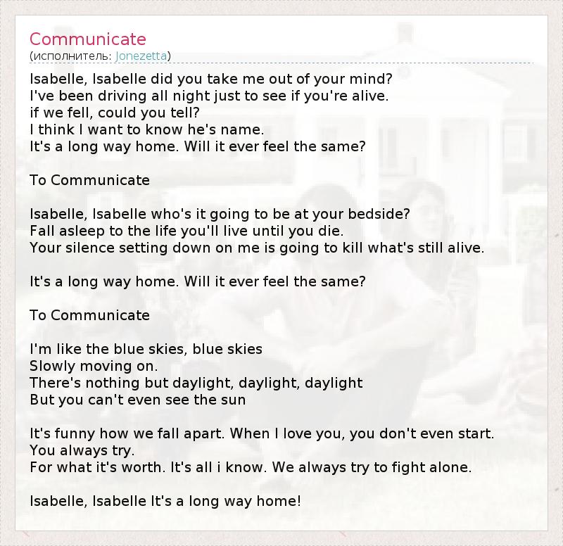 Isabelle, Isabelle did you take me out of your mind? I've been driving all night just to see if you're alive. if we fell, could you tell? I think I want to know he's name. It's a long way home. Will it ever feel the same? To Communicate Isabelle, Isabelle who's it going to be at your bedside? Fall asleep to the life you'll live until you die. Your silence setting down on me is going to kill what's still alive. It's a long way home. Will it ever feel the same? To Communicate I'm like the blue skies, blue skies Slowly moving on. There's nothing but daylight, daylight, daylight But you can't even see the sun It's funny how we fall apart. When I love you, you don't even start. You always try. For what it's worth. It's all i know. We always try to fight alone. Isabelle, Isabelle It's a long way home!