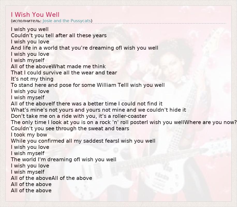 I wish you well Couldn't you tell after all these years I wish you love And life in a world that you're dreaming ofI wish you well I wish you love I wish myself All of the aboveWhat made me think That I could survive all the wear and tear It's not my thing To stand here and pose for some William TellI wish you well I wish you love I wish myself All of the aboveIf there was a better time I could not find it What's mine's not yours and yours not mine and we couldn't hide it Don't take me on a ride with you, it's a roller-coaster The only time I look at you is on a rock 'n' roll posterI wish you wellWhere are you now? Couldn't you see through the sweat and tears I took my bow While you confirmed all my saddest fearsI wish you well I wish you love I wish myself The world I'm dreaming ofI wish you well I wish you love I wish myself All of the aboveAll of the above All of the above All of the above