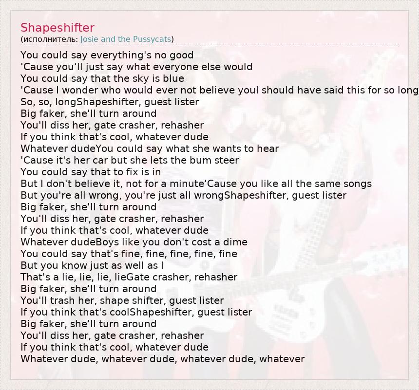 You could say everything's no good 'Cause you'll just say what everyone else would You could say that the sky is blue 'Cause I wonder who would ever not believe youI should have said this for so long So, so, longShapeshifter, guest lister Big faker, she'll turn around You'll diss her, gate crasher, rehasher If you think that's cool, whatever dude Whatever dudeYou could say what she wants to hear 'Cause it's her car but she lets the bum steer You could say that to fix is in But I don't believe it, not for a minute'Cause you like all the same songs But you're all wrong, you're just all wrongShapeshifter, guest lister Big faker, she'll turn around You'll diss her, gate crasher, rehasher If you think that's cool, whatever dude Whatever dudeBoys like you don't cost a dime You could say that's fine, fine, fine, fine, fine But you know just as well as I That's a lie, lie, lie, lieGate crasher, rehasher Big faker, she'll turn around You'll trash her, shape shifter, guest lister If you think that's coolShapeshifter, guest lister Big faker, she'll turn around You'll diss her, gate crasher, rehasher If you think that's cool, whatever dude Whatever dude, whatever dude, whatever dude, whatever