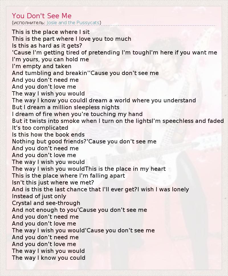 This is the place where I sit This is the part where I love you too much Is this as hard as it gets? 'Cause I'm getting tired of pretending I'm toughI'm here if you want me I'm yours, you can hold me I'm empty and taken And tumbling and breakin''Cause you don't see me And you don't need me And you don't love me The way I wish you would The way I know you couldI dream a world where you understand But I dream a million sleepless nights I dream of fire when you're touching my hand But it twists into smoke when I turn on the lightsI'm speechless and faded It's too complicated Is this how the book ends Nothing but good friends?'Cause you don't see me And you don't need me And you don't love me The way I wish you would The way I wish you wouldThis is the place in my heart This is the place where I'm falling apart Isn't this just where we met? And is this the last chance that I'll ever get?I wish I was lonely Instead of just only Crystal and see-through And not enough to you'Cause you don't see me And you don't need me And you don't love me The way I wish you would'Cause you don't see me And you don't need me And you don't love me The way I wish you would The way I know you could