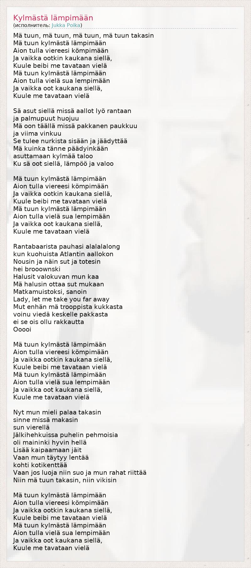 ГлавнаяИсполнителиJukka PoikaKylmästä lämpimään
