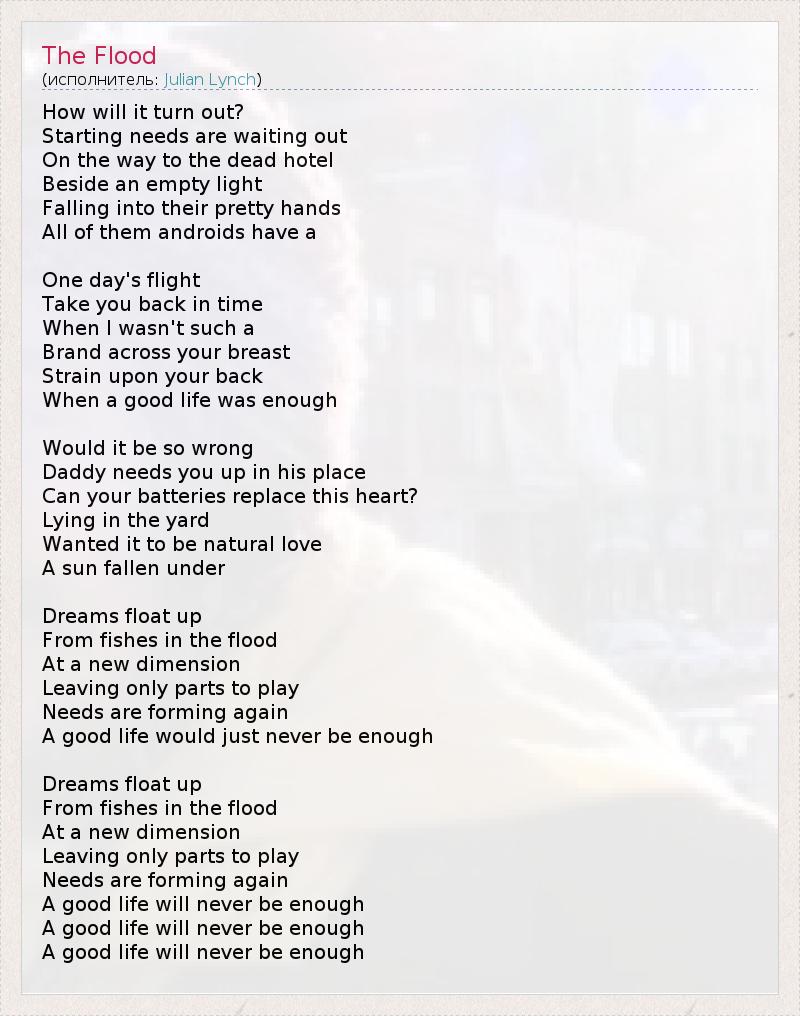 How will it turn out? Starting needs are waiting out On the way to the dead hotel Beside an empty light Falling into their pretty hands All of them androids have a One day's flight Take you back in time When I wasn't such a Brand across your breast Strain upon your back When a good life was enough Would it be so wrong Daddy needs you up in his place Can your batteries replace this heart? Lying in the yard Wanted it to be natural love A sun fallen under Dreams float up From fishes in the flood At a new dimension Leaving only parts to play Needs are forming again A good life would just never be enough Dreams float up From fishes in the flood At a new dimension Leaving only parts to play Needs are forming again A good life will never be enough A good life will never be enough A good life will never be enough