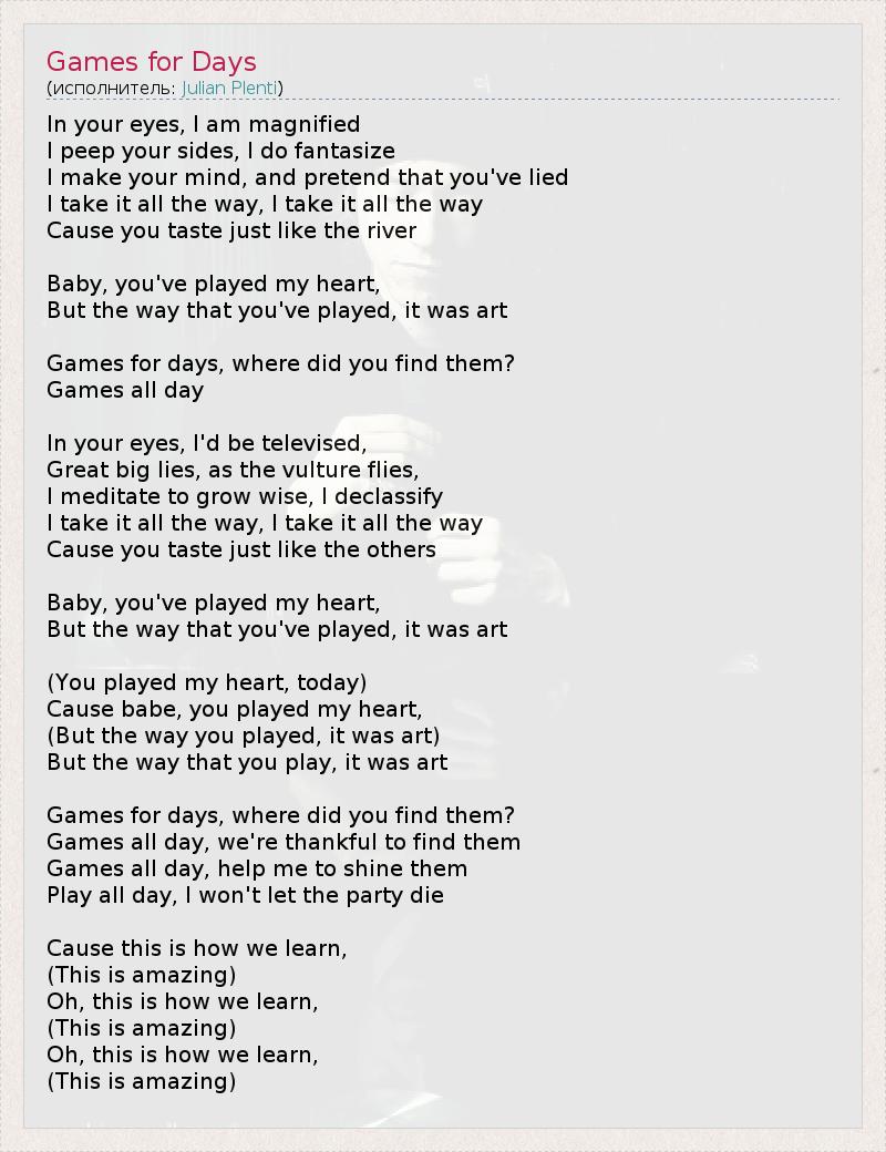 In your eyes, I am magnified I peep your sides, I do fantasize I make your mind, and pretend that you've lied I take it all the way, I take it all the way Cause you taste just like the river Baby, you've played my heart, But the way that you've played, it was art Games for days, where did you find them? Games all day In your eyes, I'd be televised, Great big lies, as the vulture flies, I meditate to grow wise, I declassify I take it all the way, I take it all the way Cause you taste just like the others Baby, you've played my heart, But the way that you've played, it was art (You played my heart, today) Cause babe, you played my heart, (But the way you played, it was art) But the way that you play, it was art Games for days, where did you find them? Games all day, we're thankful to find them Games all day, help me to shine them Play all day, I won't let the party die Cause this is how we learn, (This is amazing) Oh, this is how we learn, (This is amazing) Oh, this is how we learn, (This is amazing)