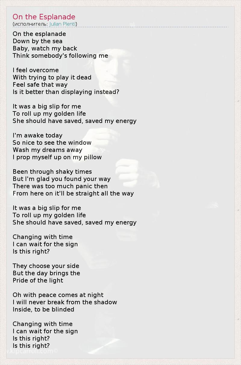 On the esplanade Down by the sea Baby, watch my back Think somebody's following me I feel overcome With trying to play it dead Feel safe that way Is it better than displaying instead? It was a big slip for me To roll up my golden life She should have saved, saved my energy I'm awake today So nice to see the window Wash my dreams away I prop myself up on my pillow Been through shaky times But I'm glad you found your way There was too much panic then From here on it'll be straight all the way It was a big slip for me To roll up my golden life She should have saved, saved my energy Changing with time I can wait for the sign Is this right? They choose your side But the day brings the Pride of the light Oh with peace comes at night I will never break from the shadow Inside, to be blinded Changing with time I can wait for the sign Is this right? Is this right?