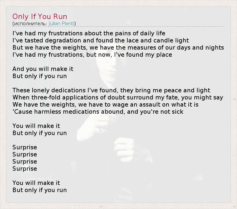 I've had my frustrations about the pains of daily life I've tasted degradation and found the lace and candle light But we have the weights, we have the measures of our days and nights I've had my frustrations, but now, I've found my place And you will make it But only if you run These lonely dedications I've found, they bring me peace and light When three-fold applications of doubt surround my fate, you might say We have the weights, we have to wage an assault on what it is 'Cause harmless medications abound, and you're not sick You will make it But only if you run Surprise Surprise Surprise Surprise You will make it But only if you run
