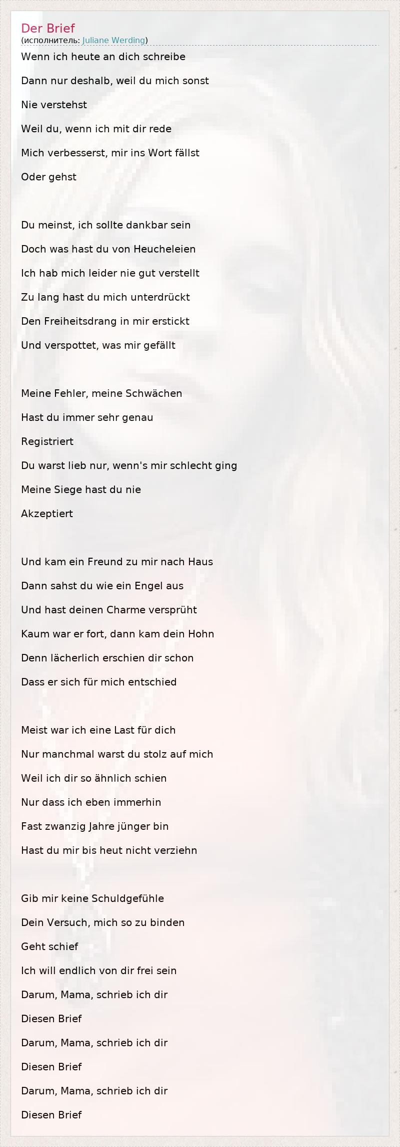 Wenn ich heute an dich schreibe Dann nur deshalb, weil du mich sonst Nie verstehst Weil du, wenn ich mit dir rede Mich verbesserst, mir ins Wort fällst Oder gehst Du meinst, ich sollte dankbar sein Doch was hast du von Heucheleien Ich hab mich leider nie gut verstellt Zu lang hast du mich unterdrückt Den Freiheitsdrang in mir erstickt Und verspottet, was mir gefällt Meine Fehler, meine Schwächen Hast du immer sehr genau Registriert Du warst lieb nur, wenn's mir schlecht ging Meine Siege hast du nie Akzeptiert Und kam ein Freund zu mir nach Haus Dann sahst du wie ein Engel aus Und hast deinen Charme versprüht Kaum war er fort, dann kam dein Hohn Denn lächerlich erschien dir schon Dass er sich für mich entschied Meist war ich eine Last für dich Nur manchmal warst du stolz auf mich Weil ich dir so ähnlich schien Nur dass ich eben immerhin Fast zwanzig Jahre jünger bin Hast du mir bis heut nicht verziehn Gib mir keine Schuldgefühle Dein Versuch, mich so zu binden Geht schief Ich will endlich von dir frei sein Darum, Mama, schrieb ich dir Diesen Brief Darum, Mama, schrieb ich dir Diesen Brief Darum, Mama, schrieb ich dir Diesen Brief