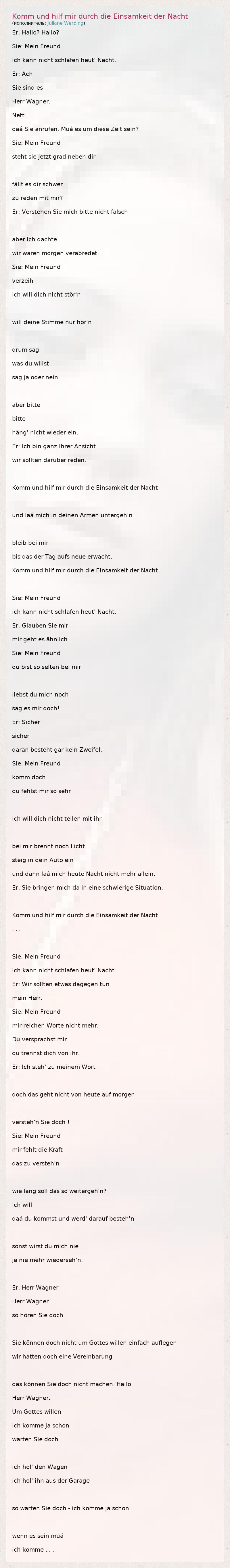 Er: Hallo? Hallo? Sie: Mein Freund ich kann nicht schlafen heut' Nacht. Er: Ach Sie sind es Herr Wagner. Nett daá Sie anrufen. Muá es um diese Zeit sein? Sie: Mein Freund steht sie jetzt grad neben dir fällt es dir schwer zu reden mit mir? Er: Verstehen Sie mich bitte nicht falsch aber ich dachte wir waren morgen verabredet. Sie: Mein Freund verzeih ich will dich nicht stör'n will deine Stimme nur hör'n drum sag was du willst sag ja oder nein aber bitte bitte häng' nicht wieder ein. Er: Ich bin ganz Ihrer Ansicht wir sollten darüber reden. Komm und hilf mir durch die Einsamkeit der Nacht und laá mich in deinen Armen untergeh'n bleib bei mir bis das der Tag aufs neue erwacht. Komm und hilf mir durch die Einsamkeit der Nacht. Sie: Mein Freund ich kann nicht schlafen heut' Nacht. Er: Glauben Sie mir mir geht es ähnlich. Sie: Mein Freund du bist so selten bei mir liebst du mich noch sag es mir doch! Er: Sicher sicher daran besteht gar kein Zweifel. Sie: Mein Freund komm doch du fehlst mir so sehr ich will dich nicht teilen mit ihr bei mir brennt noch Licht steig in dein Auto ein und dann laá mich heute Nacht nicht mehr allein. Er: Sie bringen mich da in eine schwierige Situation. Komm und hilf mir durch die Einsamkeit der Nacht . . . Sie: Mein Freund ich kann nicht schlafen heut' Nacht. Er: Wir sollten etwas dagegen tun mein Herr. Sie: Mein Freund mir reichen Worte nicht mehr. Du versprachst mir du trennst dich von ihr. Er: Ich steh' zu meinem Wort doch das geht nicht von heute auf morgen versteh'n Sie doch ! Sie: Mein Freund mir fehlt die Kraft das zu versteh'n wie lang soll das so weitergeh'n? Ich will daá du kommst und werd' darauf besteh'n sonst wirst du mich nie ja nie mehr wiederseh'n. Er: Herr Wagner Herr Wagner so hören Sie doch Sie können doch nicht um Gottes willen einfach auflegen wir hatten doch eine Vereinbarung das können Sie doch nicht machen. Hallo Herr Wagner. Um Gottes willen ich komme ja schon warten Sie doch ich hol' den Wagen ich hol' ihn aus der Garage so warten Sie doch - ich komme ja schon wenn es sein muá ich komme . . .