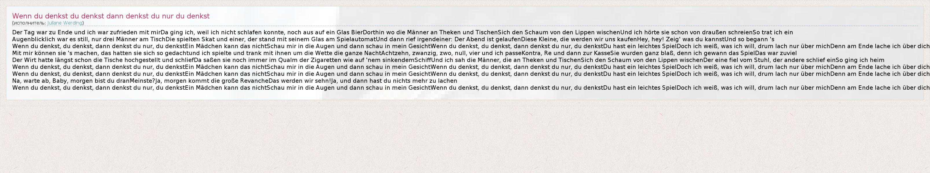 Der Tag war zu Ende und ich war zufrieden mit mirDa ging ich, weil ich nicht schlafen konnte, noch aus auf ein Glas BierDorthin wo die Männer an Theken und TischenSich den Schaum von den Lippen wischenUnd ich hörte sie schon von draußen schreienSo trat ich ein Augenblicklich war es still, nur drei Männer am TischDie spielten Skat und einer, der stand mit seinem Glas am SpielautomatUnd dann rief irgendeiner: Der Abend ist gelaufenDiese Kleine, die werden wir uns kaufenHey, hey! Zeig' was du kannstUnd so begann 's Wenn du denkst, du denkst, dann denkst du nur, du denkstEin Mädchen kann das nichtSchau mir in die Augen und dann schau in mein GesichtWenn du denkst, du denkst, dann denkst du nur, du denkstDu hast ein leichtes SpielDoch ich weiß, was ich will, drum lach nur über michDenn am Ende lache ich über dich Mit mir können sie 's machen, das hatten sie sich so gedachtund ich spielte und trank mit ihnen um die Wette die ganze NachtAchtzehn, zwanzig, zwo, null, vier und ich passeKontra, Re und dann zur KasseSie wurden ganz blaß, denn ich gewann das SpielDas war zuviel Der Wirt hatte längst schon die Tische hochgestellt und schliefDa saßen sie noch immer im Qualm der Zigaretten wie auf 'nem sinkendemSchiffUnd ich sah die Männer, die an Theken und TischenSich den Schaum von den Lippen wischenDer eine fiel vom Stuhl, der andere schlief einSo ging ich heim Wenn du denkst, du denkst, dann denkst du nur, du denkstEin Mädchen kann das nichtSchau mir in die Augen und dann schau in mein GesichtWenn du denkst, du denkst, dann denkst du nur, du denkstDu hast ein leichtes SpielDoch ich weiß, was ich will, drum lach nur über michDenn am Ende lache ich über dich Wenn du denkst, du denkst, dann denkst du nur, du denkstEin Mädchen kann das nichtSchau mir in die Augen und dann schau in mein GesichtWenn du denkst, du denkst, dann denkst du nur, du denkstDu hast ein leichtes SpielDoch ich weiß, was ich will, drum lach nur über michDenn am Ende lache ich über dich Na, warte ab, Baby, morgen bist du dranMeinste?Ja, morgen kommt die große RevancheDas werden wir sehn!Ja, und dann hast du nichts mehr zu lachen Wenn du denkst, du denkst, dann denkst du nur, du denkstEin Mädchen kann das nichtSchau mir in die Augen und dann schau in mein GesichtWenn du denkst, du denkst, dann denkst du nur, du denkstDu hast ein leichtes SpielDoch ich weiß, was ich will, drum lach nur über michDenn am Ende lache ich über dich