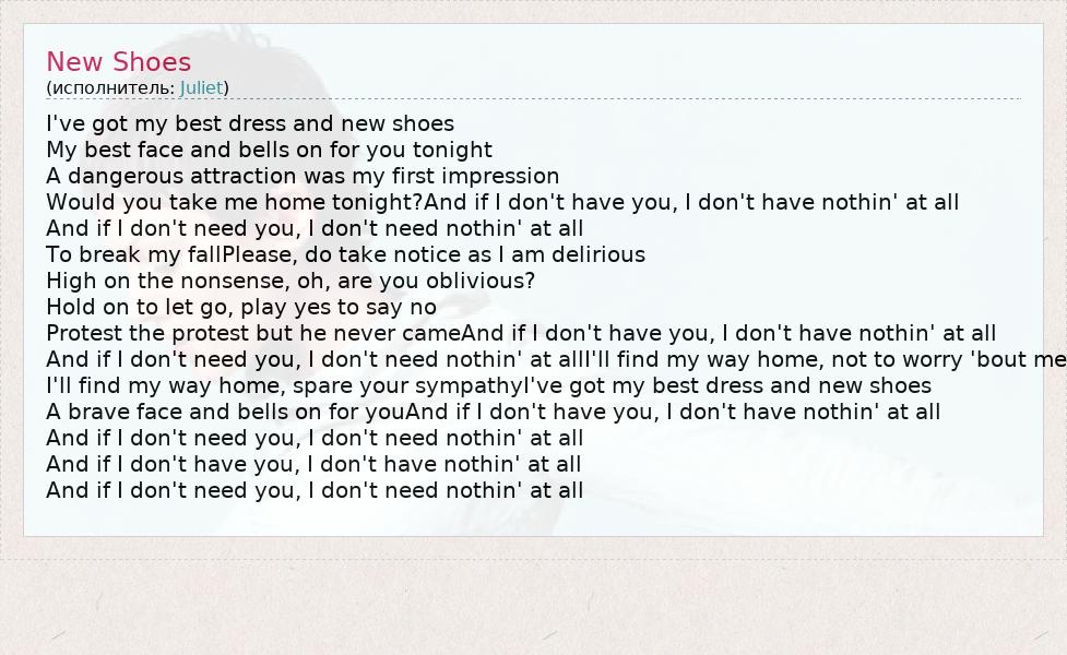I've got my best dress and new shoes My best face and bells on for you tonight A dangerous attraction was my first impression Would you take me home tonight?And if I don't have you, I don't have nothin' at all And if I don't need you, I don't need nothin' at all To break my fallPlease, do take notice as I am delirious High on the nonsense, oh, are you oblivious? Hold on to let go, play yes to say no Protest the protest but he never cameAnd if I don't have you, I don't have nothin' at all And if I don't need you, I don't need nothin' at allI'll find my way home, not to worry 'bout me I'll find my way home, spare your sympathyI've got my best dress and new shoes A brave face and bells on for youAnd if I don't have you, I don't have nothin' at all And if I don't need you, I don't need nothin' at all And if I don't have you, I don't have nothin' at all And if I don't need you, I don't need nothin' at all