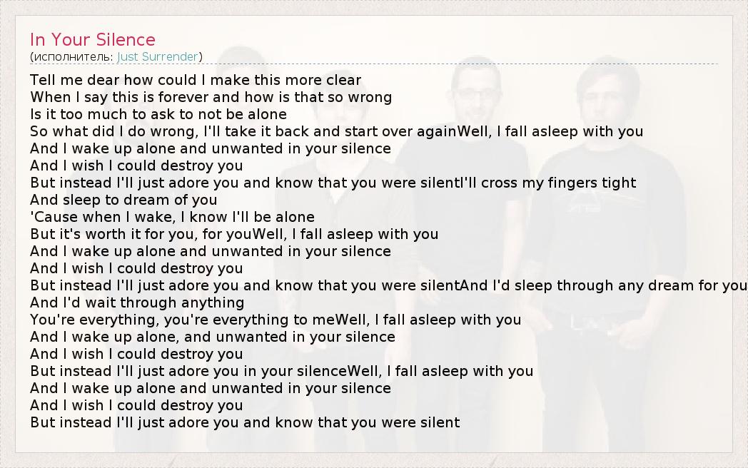 Tell me dear how could I make this more clear When I say this is forever and how is that so wrong Is it too much to ask to not be alone So what did I do wrong, I'll take it back and start over againWell, I fall asleep with you And I wake up alone and unwanted in your silence And I wish I could destroy you But instead I'll just adore you and know that you were silentI'll cross my fingers tight And sleep to dream of you 'Cause when I wake, I know I'll be alone But it's worth it for you, for youWell, I fall asleep with you And I wake up alone and unwanted in your silence And I wish I could destroy you But instead I'll just adore you and know that you were silentAnd I'd sleep through any dream for you And I'd wait through anything You're everything, you're everything to meWell, I fall asleep with you And I wake up alone, and unwanted in your silence And I wish I could destroy you But instead I'll just adore you in your silenceWell, I fall asleep with you And I wake up alone and unwanted in your silence And I wish I could destroy you But instead I'll just adore you and know that you were silent