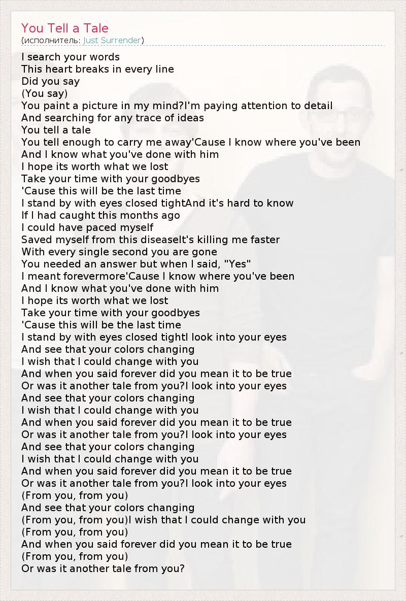 I search your words This heart breaks in every line Did you say (You say) You paint a picture in my mind?I'm paying attention to detail And searching for any trace of ideas You tell a tale You tell enough to carry me away'Cause I know where you've been And I know what you've done with him I hope its worth what we lost Take your time with your goodbyes 'Cause this will be the last time I stand by with eyes closed tightAnd it's hard to know If I had caught this months ago I could have paced myself Saved myself from this diseaseIt's killing me faster With every single second you are gone You needed an answer but when I said, "Yes" I meant forevermore'Cause I know where you've been And I know what you've done with him I hope its worth what we lost Take your time with your goodbyes 'Cause this will be the last time I stand by with eyes closed tightI look into your eyes And see that your colors changing I wish that I could change with you And when you said forever did you mean it to be true Or was it another tale from you?I look into your eyes And see that your colors changing I wish that I could change with you And when you said forever did you mean it to be true Or was it another tale from you?I look into your eyes And see that your colors changing I wish that I could change with you And when you said forever did you mean it to be true Or was it another tale from you?I look into your eyes (From you, from you) And see that your colors changing (From you, from you)I wish that I could change with you (From you, from you) And when you said forever did you mean it to be true (From you, from you) Or was it another tale from you?