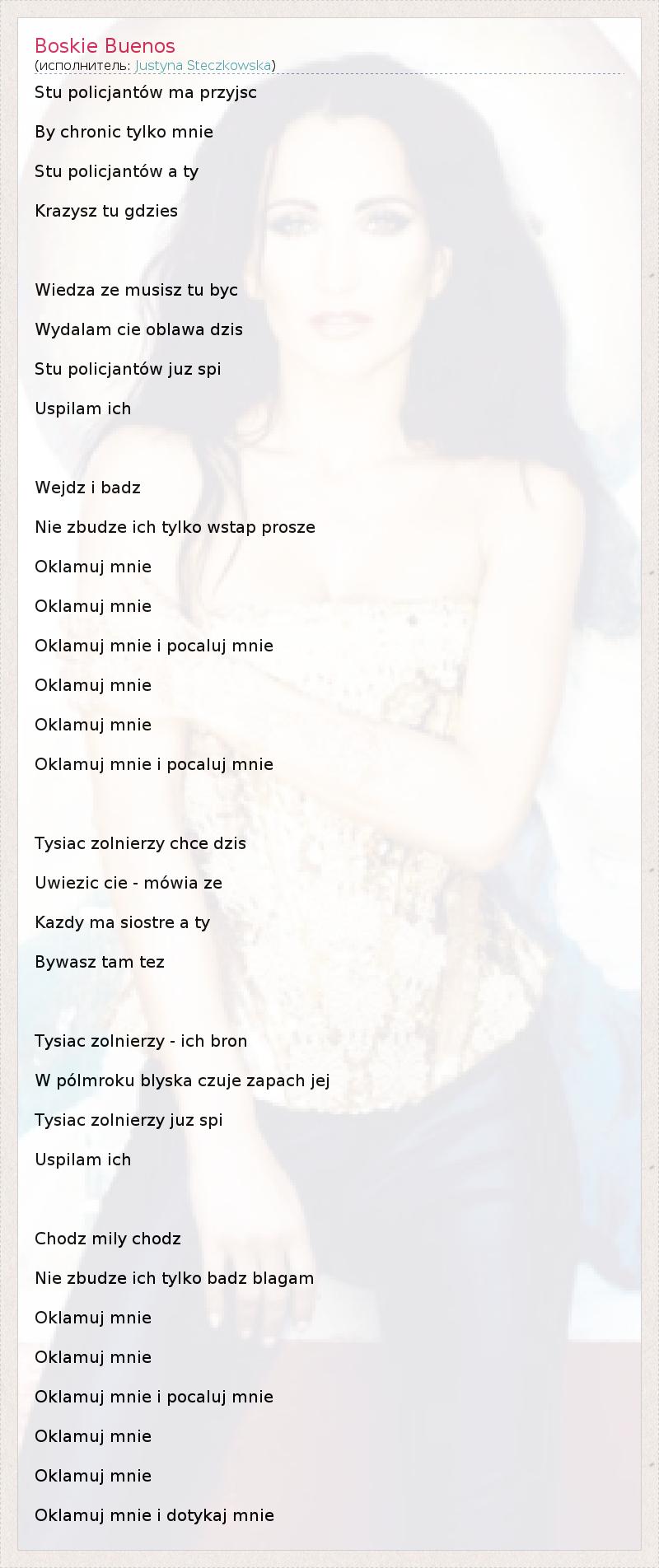 Это интересно:Юстина Стечковска (польск. Justyna Steczkowska), род. 2 августа 1972(19720802) в Жешуве — польская певица, скрипачка, актриса. Обладательница почти четырёхоктавного диапазона.Дебютировала в телепрограмме «Шанс на успех» (польск. Szansa na sukces), в 1994 году получила Гран-при на Всепольском фестивале в Ополе, в 1995 — на фестивале балтийских стран в Карлсхамне.Выпустила первый диск «Девушка шамана», ставший... продолжение