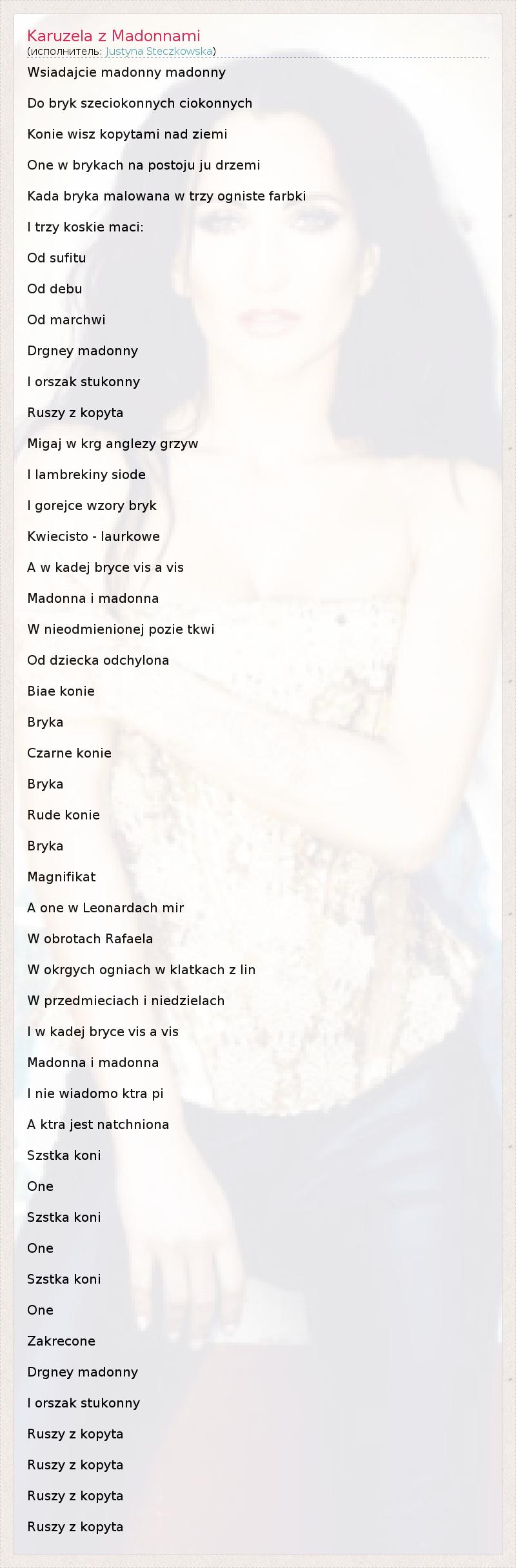 Wsiadajcie madonny madonny Do bryk szeciokonnych ciokonnych Konie wisz kopytami nad ziemi One w brykach na postoju ju drzemi Kada bryka malowana w trzy ogniste farbki I trzy koskie maci: Od sufitu Od debu Od marchwi Drgney madonny I orszak stukonny Ruszy z kopyta Migaj w krg anglezy grzyw I lambrekiny siode I gorejce wzory bryk Kwiecisto - laurkowe A w kadej bryce vis a vis Madonna i madonna W nieodmienionej pozie tkwi Od dziecka odchylona Biae konie Bryka Czarne konie Bryka Rude konie Bryka Magnifikat A one w Leonardach mir W obrotach Rafaela W okrgych ogniach w klatkach z lin W przedmieciach i niedzielach I w kadej bryce vis a vis Madonna i madonna I nie wiadomo ktra pi A ktra jest natchniona Szstka koni One Szstka koni One Szstka koni One Zakrecone Drgney madonny I orszak stukonny Ruszy z kopyta Ruszy z kopyta Ruszy z kopyta Ruszy z kopyta