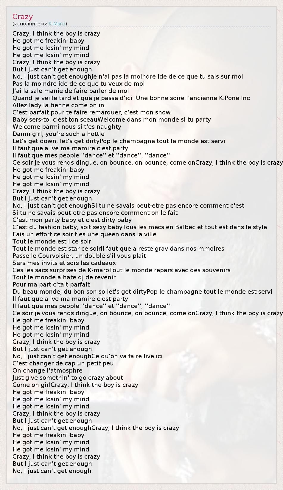 Crazy, I think the boy is crazy He got me freakin' baby He got me losin' my mind He got me losin' my mind Crazy, I think the boy is crazy But I just can't get enough No, I just can't get enoughJe n'ai pas la moindre ide de ce que tu sais sur moi Pas la moindre ide de ce que tu veux de moi J'ai la sale manie de faire parler de moi Quand je veille tard et que je passe d'ici lUne bonne soire l'ancienne K.Pone Inc Allez lady la tienne come on in C'est parfait pour te faire remarquer, c'est mon show Baby sers-toi c'est ton sceauWelcome dans mon monde si tu party Welcome parmi nous si t'es naughty Damn girl, you're such a hottie Let's get down, let's get dirtyPop le champagne tout le monde est servi Il faut que a lve ma mamire c'est party Il faut que mes people ''dance'' et ''dance'', ''dance'' Ce soir je vous rends dingue, on bounce, on bounce, come onCrazy, I think the boy is crazy He got me freakin' baby He got me losin' my mind He got me losin' my mind Crazy, I think the boy is crazy But I just can't get enough No, I just can't get enoughSi tu ne savais peut-etre pas encore comment c'est Si tu ne savais peut-etre pas encore comment on le fait C'est mon party baby et c'est dirty baby C'est du fashion baby, soit sexy babyTous les mecs en Balbec et tout est dans le style Fais un effort ce soir t'es une queen dans la ville Tout le monde est l ce soir Tout le monde est star ce soirIl faut que a reste grav dans nos mmoires Passe le Courvoisier, un double s'il vous plait Sers mes invits et sors les cadeaux Ces les sacs surprises de K-maroTout le monde repars avec des souvenirs Tout le monde a hate dj de revenir Pour ma part c'tait parfait Du beau monde, du bon son so let's get dirtyPop le champagne tout le monde est servi Il faut que a lve ma mamire c'est party Il faut que mes people ''dance'' et ''dance'', ''dance'' Ce soir je vous rends dingue, on bounce, on bounce, come onCrazy, I think the boy is crazy He got me freakin' baby He got me losin' my mind He got me losin' my mind Crazy, I think the boy is crazy But I just can't get enough No, I just can't get enoughCe qu'on va faire live ici C'est changer de cap un petit peu On change l'atmosphre Just give somethin' to go crazy about Come on girlCrazy, I think the boy is crazy He got me freakin' baby He got me losin' my mind He got me losin' my mind Crazy, I think the boy is crazy But I just can't get enough No, I just can't get enoughCrazy, I think the boy is crazy He got me freakin' baby He got me losin' my mind He got me losin' my mind Crazy, I think the boy is crazy But I just can't get enough No, I just can't get enough