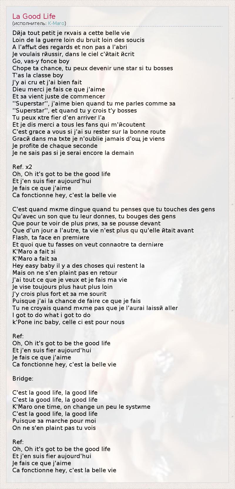 Dйjа tout petit je rкvais а cette belle vie Loin de la guerre loin du bruit loin des soucis A l'affыt des regards et non pas а l'abri Je voulais rйussir, dans le ciel c'йtait йcrit Go, vas-y fonce boy Chope ta chance, tu peux devenir une star si tu bosses T'as la classe boy J'y ai cru et j'ai bien fait Dieu merci je fais ce que j'aime Et зa vient juste de commencer ''Superstar'', j'aime bien quand tu me parles comme зa ''Superstar'', et quand tu y crois t'y bosses Tu peux кtre fier d'en arriver l'а Et je dis merci а tous les fans qui m'йcoutent C'est grвce а vous si j'ai su rester sur la bonne route Gracй dans ma tкte je n'oublie jamais d'oщ je viens Je profite de chaque seconde Je ne sais pas si je serai encore lа demain Ref. x2 Oh, Oh it's got to be the good life Et j'en suis fier aujourd'hui Je fais ce que j'aime Ca fonctionne hey, c'est la belle vie C'est quand mкme dingue quand tu penses que tu touches des gens Qu'avec un son que tu leur donnes, tu bouges des gens Que pour te voir de plus prиs, зa se pousse devant Que d'un jour а l'autre, ta vie n'est plus qu qu'elle йtait avant Flash, ta face en premiиre Et quoi que tu fasses on veut connaоtre ta derniиre K'Maro a fait зi K'Maro a fait зa Hey easy baby il y a des choses qui restent lа Mais on ne s'en plaint pas en retour J'ai tout ce que je veux et je fais ma vie Je vise toujours plus haut plus loin J'y crois plus fort et зa me sourit Puisque j'ai la chance de faire ce que je fais Tu ne croyais quand mкme pas que je l'aurai laissй aller I got to do what i got to do k'Pone inc baby, celle ci est pour nous Ref: Oh, Oh it's got to be the good life Et j'en suis fier aujourd'hui Je fais ce que j'aime Ca fonctionne hey, c'est la belle vie Bridge: C'est la good life, la good life C'est la good life, la good life K'Maro one time, on change un peu le systиme C'est la good life, la good life Puisque зa marche pour moi On ne s'en plaint pas tu vois Ref: Oh, Oh it's got to be the good life Et j'en suis fier aujourd'hui Je fais ce que j'aime Ca fonctionne hey, c'est la belle vie