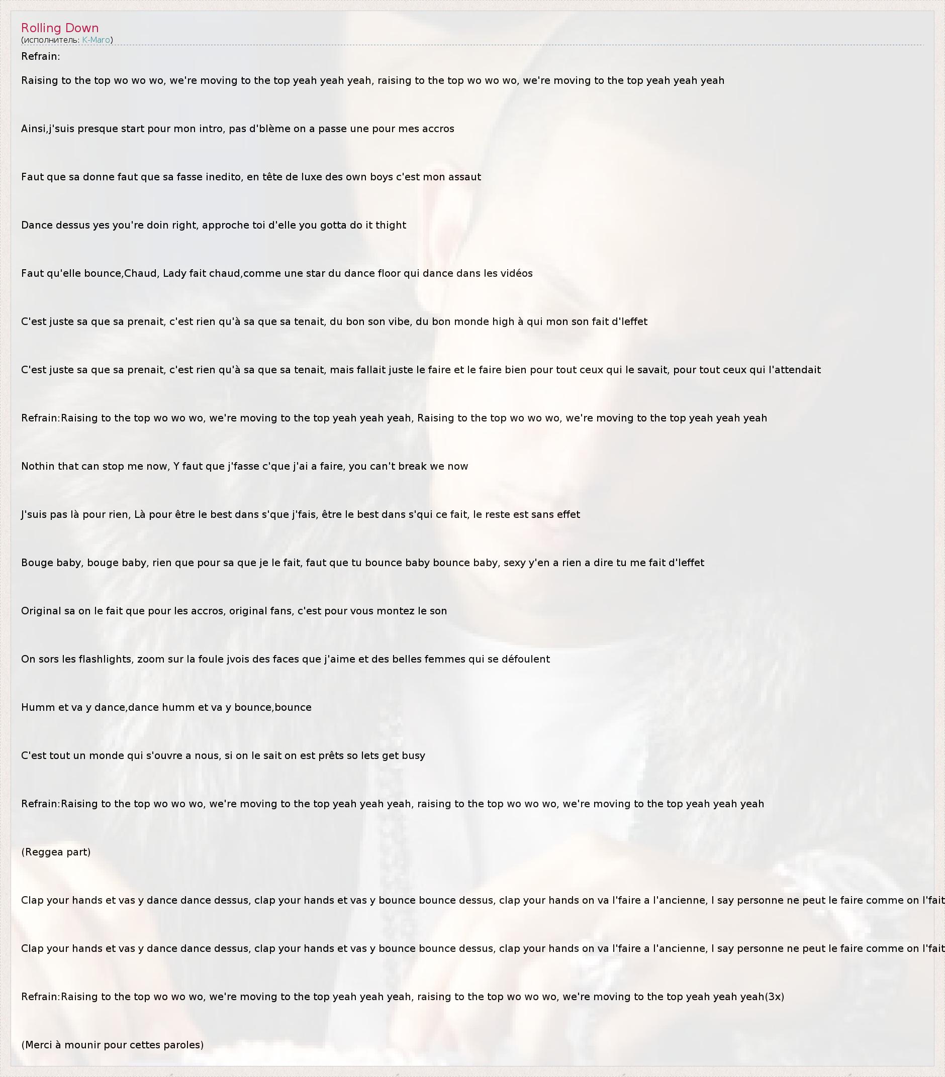 Refrain: Raising to the top wo wo wo, we're moving to the top yeah yeah yeah, raising to the top wo wo wo, we're moving to the top yeah yeah yeah Ainsi,j'suis presque start pour mon intro, pas d'blème on a passe une pour mes accros Faut que sa donne faut que sa fasse inedito, en tête de luxe des own boys c'est mon assaut Dance dessus yes you're doin right, approche toi d'elle you gotta do it thight Faut qu'elle bounce,Chaud, Lady fait chaud,comme une star du dance floor qui dance dans les vidéos C'est juste sa que sa prenait, c'est rien qu'à sa que sa tenait, du bon son vibe, du bon monde high à qui mon son fait d'leffet C'est juste sa que sa prenait, c'est rien qu'à sa que sa tenait, mais fallait juste le faire et le faire bien pour tout ceux qui le savait, pour tout ceux qui l'attendait Refrain:Raising to the top wo wo wo, we're moving to the top yeah yeah yeah, Raising to the top wo wo wo, we're moving to the top yeah yeah yeah Nothin that can stop me now, Y faut que j'fasse c'que j'ai a faire, you can't break we now J'suis pas là pour rien, Là pour être le best dans s'que j'fais, être le best dans s'qui ce fait, le reste est sans effet Bouge baby, bouge baby, rien que pour sa que je le fait, faut que tu bounce baby bounce baby, sexy y'en a rien a dire tu me fait d'leffet Original sa on le fait que pour les accros, original fans, c'est pour vous montez le son On sors les flashlights, zoom sur la foule jvois des faces que j'aime et des belles femmes qui se défoulent Humm et va y dance,dance humm et va y bounce,bounce C'est tout un monde qui s'ouvre a nous, si on le sait on est prêts so lets get busy Refrain:Raising to the top wo wo wo, we're moving to the top yeah yeah yeah, raising to the top wo wo wo, we're moving to the top yeah yeah yeah (Reggea part) Clap your hands et vas y dance dance dessus, clap your hands et vas y bounce bounce dessus, clap your hands on va l'faire a l'ancienne, I say personne ne peut le faire comme on l'fait Clap your hands et vas y dance dance dessus, clap your hands et vas y bounce bounce dessus, clap your hands on va l'faire a l'ancienne, I say personne ne peut le faire comme on l'fait Refrain:Raising to the top wo wo wo, we're moving to the top yeah yeah yeah, raising to the top wo wo wo, we're moving to the top yeah yeah yeah(3x) (Merci à mounir pour cettes paroles)