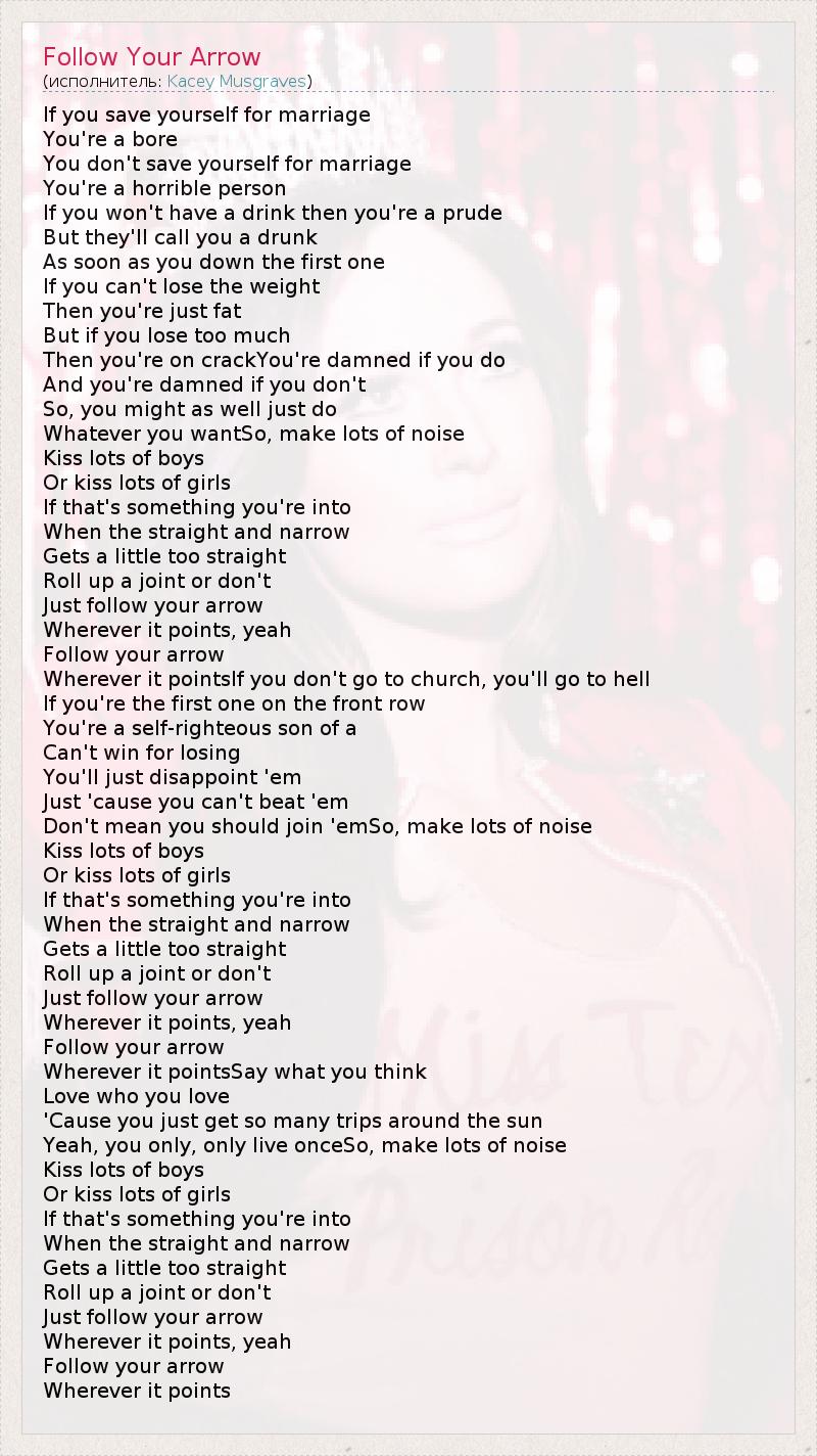 If you save yourself for marriage You're a bore You don't save yourself for marriage You're a horrible person If you won't have a drink then you're a prude But they'll call you a drunk As soon as you down the first one If you can't lose the weight Then you're just fat But if you lose too much Then you're on crackYou're damned if you do And you're damned if you don't So, you might as well just do Whatever you wantSo, make lots of noise Kiss lots of boys Or kiss lots of girls If that's something you're into When the straight and narrow Gets a little too straight Roll up a joint or don't Just follow your arrow Wherever it points, yeah Follow your arrow Wherever it pointsIf you don't go to church, you'll go to hell If you're the first one on the front row You're a self-righteous son of a Can't win for losing You'll just disappoint 'em Just 'cause you can't beat 'em Don't mean you should join 'emSo, make lots of noise Kiss lots of boys Or kiss lots of girls If that's something you're into When the straight and narrow Gets a little too straight Roll up a joint or don't Just follow your arrow Wherever it points, yeah Follow your arrow Wherever it pointsSay what you think Love who you love 'Cause you just get so many trips around the sun Yeah, you only, only live onceSo, make lots of noise Kiss lots of boys Or kiss lots of girls If that's something you're into When the straight and narrow Gets a little too straight Roll up a joint or don't Just follow your arrow Wherever it points, yeah Follow your arrow Wherever it points