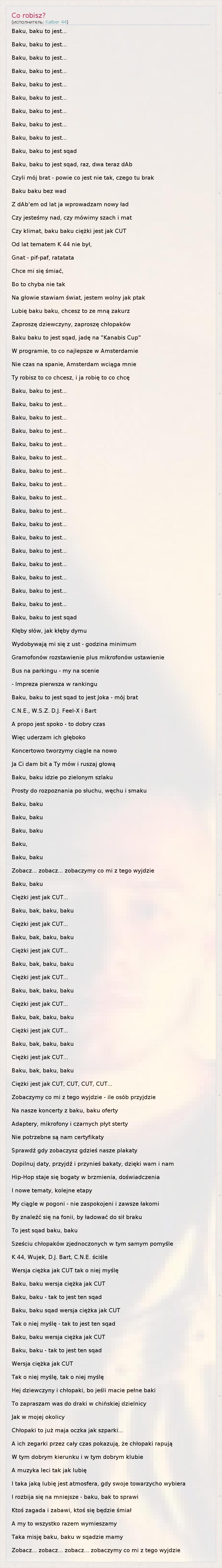 Baku, baku to jest... Baku, baku to jest... Baku, baku to jest... Baku, baku to jest... Baku, baku to jest... Baku, baku to jest... Baku, baku to jest... Baku, baku to jest... Baku, baku to jest... Baku, baku to jest sqad Baku, baku to jest sqad, raz, dwa teraz dAb Czyli mój brat - powie co jest nie tak, czego tu brak Baku baku bez wad Z dAb'em od lat ja wprowadzam nowy ład Czy jesteśmy nad, czy mówimy szach i mat Czy klimat, baku baku ciężki jest jak CUT Od lat tematem K 44 nie był, Gnat - pif-paf, ratatata Chce mi się śmiać, Bo to chyba nie tak Na głowie stawiam świat, jestem wolny jak ptak Lubię baku baku, chcesz to ze mną zakurz Zaproszę dziewczyny, zaproszę chłopaków Baku baku to jest sqad, jadę na "Kanabis Cup" W programie, to co najlepsze w Amsterdamie Nie czas na spanie, Amsterdam wciąga mnie Ty robisz to co chcesz, i ja robię to co chcę Baku, baku to jest... Baku, baku to jest... Baku, baku to jest... Baku, baku to jest... Baku, baku to jest... Baku, baku to jest... Baku, baku to jest... Baku, baku to jest... Baku, baku to jest... Baku, baku to jest... Baku, baku to jest... Baku, baku to jest... Baku, baku to jest... Baku, baku to jest... Baku, baku to jest... Baku, baku to jest... Baku, baku to jest... Baku, baku to jest sqad Kłęby słów, jak kłęby dymu Wydobywają mi się z ust - godzina minimum Gramofonów rozstawienie plus mikrofonów ustawienie Bus na parkingu - my na scenie - Impreza pierwsza w rankingu Baku, baku to jest sqad to jest Joka - mój brat C.N.E., W.S.Z. D.J. Feel-X i Bart A propo jest spoko - to dobry czas Więc uderzam ich głęboko Koncertowo tworzymy ciągle na nowo Ja Ci dam bit a Ty mów i ruszaj głową Baku, baku idzie po zielonym szlaku Prosty do rozpoznania po słuchu, węchu i smaku Baku, baku Baku, baku Baku, baku Baku, Baku, baku Zobacz... zobacz... zobaczymy co mi z tego wyjdzie Baku, baku Ciężki jest jak CUT... Baku, bak, baku, baku Ciężki jest jak CUT... Baku, bak, baku, baku Ciężki jest jak CUT... Baku, bak, baku, baku Ciężki jest jak CUT... Baku, bak, baku, baku Ciężki jest jak CUT... Baku, bak, baku, baku Ciężki jest jak CUT... Baku, bak, baku, baku Ciężki jest jak CUT... Baku, bak, baku, baku Ciężki jest jak CUT, CUT, CUT, CUT... Zobaczymy co mi z tego wyjdzie - ile osób przyjdzie Na nasze koncerty z baku, baku oferty Adaptery, mikrofony i czarnych płyt sterty Nie potrzebne są nam certyfikaty Sprawdź gdy zobaczysz gdzieś nasze plakaty Dopilnuj daty, przyjdź i przynieś bakaty, dzięki wam i nam Hip-Hop staje się bogaty w brzmienia, doświadczenia I nowe tematy, kolejne etapy My ciągle w pogoni - nie zaspokojeni i zawsze łakomi By znaleźć się na fonii, by ładować do sił braku To jest sqad baku, baku Sześciu chłopaków zjednoczonych w tym samym pomyśle K 44, Wujek, D.J. Bart, C.N.E. ściśle Wersja ciężka jak CUT tak o niej myślę Baku, baku wersja ciężka jak CUT Baku, baku - tak to jest ten sqad Baku, baku sqad wersja ciężka jak CUT Tak o niej myślę - tak to jest ten sqad Baku, baku wersja ciężka jak CUT Baku, baku - tak to jest ten sqad Wersja ciężka jak CUT Tak o niej myślę, tak o niej myślę Hej dziewczyny i chłopaki, bo jeśli macie pełne baki To zapraszam was do draki w chińskiej dzielnicy Jak w mojej okolicy Chłopaki to już maja oczka jak szparki... A ich zegarki przez cały czas pokazują, że chłopaki rapują W tym dobrym kierunku i w tym dobrym klubie A muzyka leci tak jak lubię I taka jaką lubię jest atmosfera, gdy swoje towarzycho wybiera I rozbija się na mniejsze - baku, bak to sprawi Ktoś zagada i zabawi, ktoś się będzie śmiał A my to wszystko razem wymieszamy Taka misję baku, baku w sqadzie mamy Zobacz... zobacz... zobacz... zobaczymy co mi z tego wyjdzie