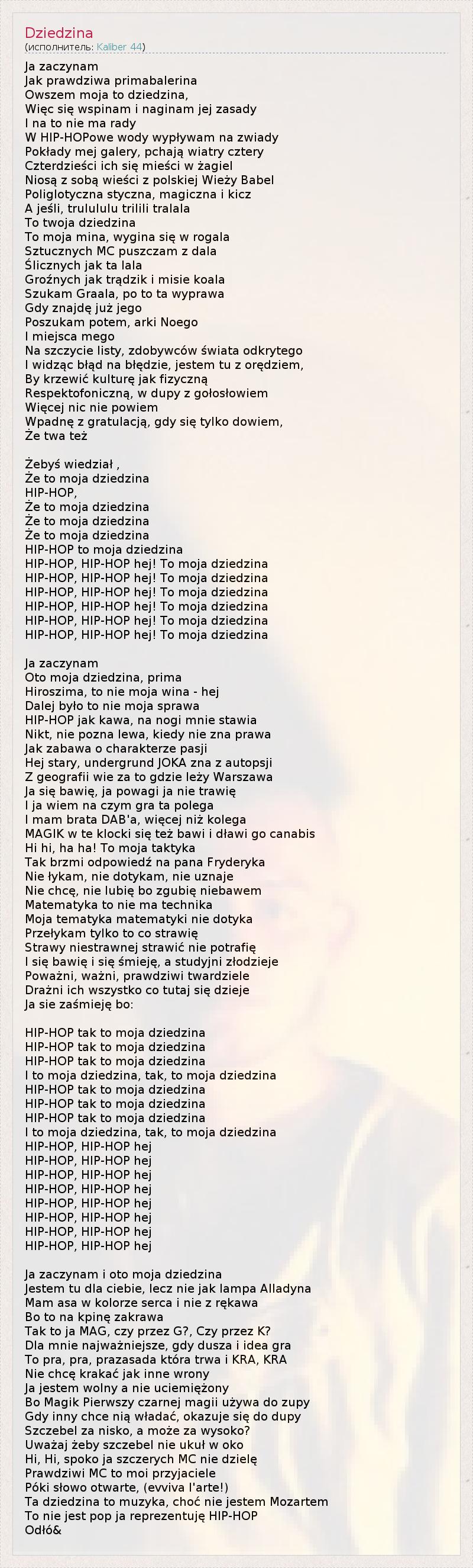 Ja zaczynam Jak prawdziwa primabalerina Owszem moja to dziedzina, Więc się wspinam i naginam jej zasady I na to nie ma rady W HIP-HOPowe wody wypływam na zwiady Pokłady mej galery, pchają wiatry cztery Czterdzieści ich się mieści w żagiel Niosą z sobą wieści z polskiej Wieży Babel Poliglotyczna styczna, magiczna i kicz A jeśli, trulululu trilili tralala To twoja dziedzina To moja mina, wygina się w rogala Sztucznych MC puszczam z dala Ślicznych jak ta lala Groźnych jak trądzik i misie koala Szukam Graala, po to ta wyprawa Gdy znajdę już jego Poszukam potem, arki Noego I miejsca mego Na szczycie listy, zdobywców świata odkrytego I widząc błąd na błędzie, jestem tu z orędziem, By krzewić kulturę jak fizyczną Respektofoniczną, w dupy z gołosłowiem Więcej nic nie powiem Wpadnę z gratulacją, gdy się tylko dowiem, Że twa też Żebyś wiedział , Że to moja dziedzina HIP-HOP, Że to moja dziedzina Że to moja dziedzina Że to moja dziedzina HIP-HOP to moja dziedzina HIP-HOP, HIP-HOP hej! To moja dziedzina HIP-HOP, HIP-HOP hej! To moja dziedzina HIP-HOP, HIP-HOP hej! To moja dziedzina HIP-HOP, HIP-HOP hej! To moja dziedzina HIP-HOP, HIP-HOP hej! To moja dziedzina HIP-HOP, HIP-HOP hej! To moja dziedzina Ja zaczynam Oto moja dziedzina, prima Hiroszima, to nie moja wina - hej Dalej było to nie moja sprawa HIP-HOP jak kawa, na nogi mnie stawia Nikt, nie pozna lewa, kiedy nie zna prawa Jak zabawa o charakterze pasji Hej stary, undergrund JOKA zna z autopsji Z geografii wie za to gdzie leży Warszawa Ja się bawię, ja powagi ja nie trawię I ja wiem na czym gra ta polega I mam brata DAB'a, więcej niż kolega MAGIK w te klocki się też bawi i dławi go canabis Hi hi, ha ha! To moja taktyka Tak brzmi odpowiedź na pana Fryderyka Nie łykam, nie dotykam, nie uznaje Nie chcę, nie lubię bo zgubię niebawem Matematyka to nie ma technika Moja tematyka matematyki nie dotyka Przełykam tylko to co strawię Strawy niestrawnej strawić nie potrafię I się bawię i się śmieję, a studyjni złodzieje Poważni, ważni, prawdziwi twardziele Drażni ich wszystko co tutaj się dzieje Ja sie zaśmieję bo: HIP-HOP tak to moja dziedzina HIP-HOP tak to moja dziedzina HIP-HOP tak to moja dziedzina I to moja dziedzina, tak, to moja dziedzina HIP-HOP tak to moja dziedzina HIP-HOP tak to moja dziedzina HIP-HOP tak to moja dziedzina I to moja dziedzina, tak, to moja dziedzina HIP-HOP, HIP-HOP hej HIP-HOP, HIP-HOP hej HIP-HOP, HIP-HOP hej HIP-HOP, HIP-HOP hej HIP-HOP, HIP-HOP hej HIP-HOP, HIP-HOP hej HIP-HOP, HIP-HOP hej HIP-HOP, HIP-HOP hej Ja zaczynam i oto moja dziedzina Jestem tu dla ciebie, lecz nie jak lampa Alladyna Mam asa w kolorze serca i nie z rękawa Bo to na kpinę zakrawa Tak to ja MAG, czy przez G?, Czy przez K? Dla mnie najważniejsze, gdy dusza i idea gra To pra, pra, prazasada która trwa i KRA, KRA Nie chcę krakać jak inne wrony Ja jestem wolny a nie uciemiężony Bo Magik Pierwszy czarnej magii używa do zupy Gdy inny chce nią władać, okazuje się do dupy Szczebel za nisko, a może za wysoko? Uważaj żeby szczebel nie ukuł w oko Hi, Hi, spoko ja szczerych MC nie dzielę Prawdziwi MC to moi przyjaciele Póki słowo otwarte, (evviva l'arte!) Ta dziedzina to muzyka, choć nie jestem Mozartem To nie jest pop ja reprezentuję HIP-HOP Odłó&