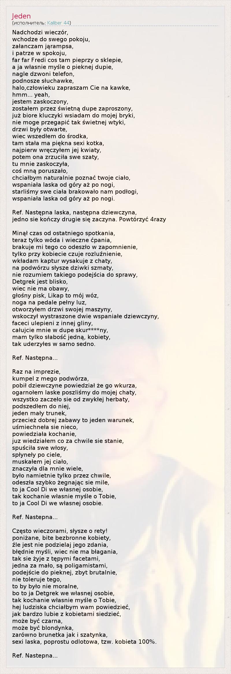 Nadchodzi wieczór, wchodze do swego pokoju, załanczam jąrampsa, i patrze w spokoju, far far Fredi cos tam pieprzy o sklepie, a ja własnie myśle o pieknej dupie, nagle dzwoni telefon, podnosze słuchawke, halo,człowieku zapraszam Cie na kawke, hmm... yeah, jestem zaskoczony, zostałem przez świetną dupe zaproszony, już biore kluczyki wsiadam do mojej bryki, nie moge przegapić tak świetnej wtyki, drzwi były otwarte, wiec wszedłem do środka, tam stała ma piękna sexi kotka, najpierw wręczyłem jej kwiaty, potem ona zrzuciła swe szaty, tu mnie zaskoczyła, coś mną poruszało, chciałbym naturalnie poznać twoje ciało, wspaniała laska od góry aż po nogi, starliśmy swe ciała brakowało nam podłogi, wspaniała laska od góry aż po nogi. Ref. Następna laska, następna dziewczyna, jedno sie kończy drugie się zaczyna. Powtórzyć 4razy Minął czas od ostatniego spotkania, teraz tylko wóda i wieczne ćpania, brakuje mi tego co odeszło w zapomnienie, tylko przy kobiecie czuje rozluźnienie, wkładam kaptur wysakuje z chaty, na podwórzu słysze dziwki szmaty, nie rozumiem takiego podejścia do sprawy, Detgrek jest blisko, wiec nie ma obawy, głośny pisk, Likap to mój wóz, noga na pedale pełny luz, otworzyłem drzwi swojej maszyny, wskoczył wystraszone dwie wspaniałe dziewczyny, faceci ulepieni z innej gliny, całujcie mnie w dupe skur****ny, mam tylko słabość jedną, kobiety, tak uderzyłes w samo sedno. Ref. Następna... Raz na imprezie, kumpel z mego podwórza, pobił dziewczyne powiedział że go wkurza, ogarnołem laske poszliśmy do mojej chaty, wszystko zaczeło sie od zwykłej herbaty, podszedłem do niej, jeden mały trunek, przecież dobrej zabawy to jeden warunek, uśmiechneła sie nieco, powiedziała kochanie, juz wiedziałem co za chwile sie stanie, spuściła swe włosy, spłyneły po ciele, muskałem jej ciało, znaczyła dla mnie wiele, było namietnie tylko przez chwile, odeszła szybko żegnając sie mile, to ja Cool Di we własnej osobie, tak kochanie własnie myśle o Tobie, to ja Cool Di we własnej osobie. Ref. Nastepna... Często wieczorami, słysze o rety! poniżane, bite bezbronne kobiety, źle jest nie podzielaj jego zdania, błędnie myśli, wiec nie ma błagania, tak sie żyje z tępymi facetami, jedna za mało, są poligamistami, podejście do pieknej, zbyt brutalnie, nie toleruje tego, to by było nie moralne, bo to ja Detgrek we własnej osobie, tak kochanie własnie myśle o Tobie, hej ludziska chciałbym wam powiedzieć, jak bardzo lubie z kobietami siedzieć, może być czarna, może być blondynka, zarówno brunetka jak i szatynka, sexi laska, poprostu odlotowa, tzw. kobieta 100%. Ref. Nastepna...