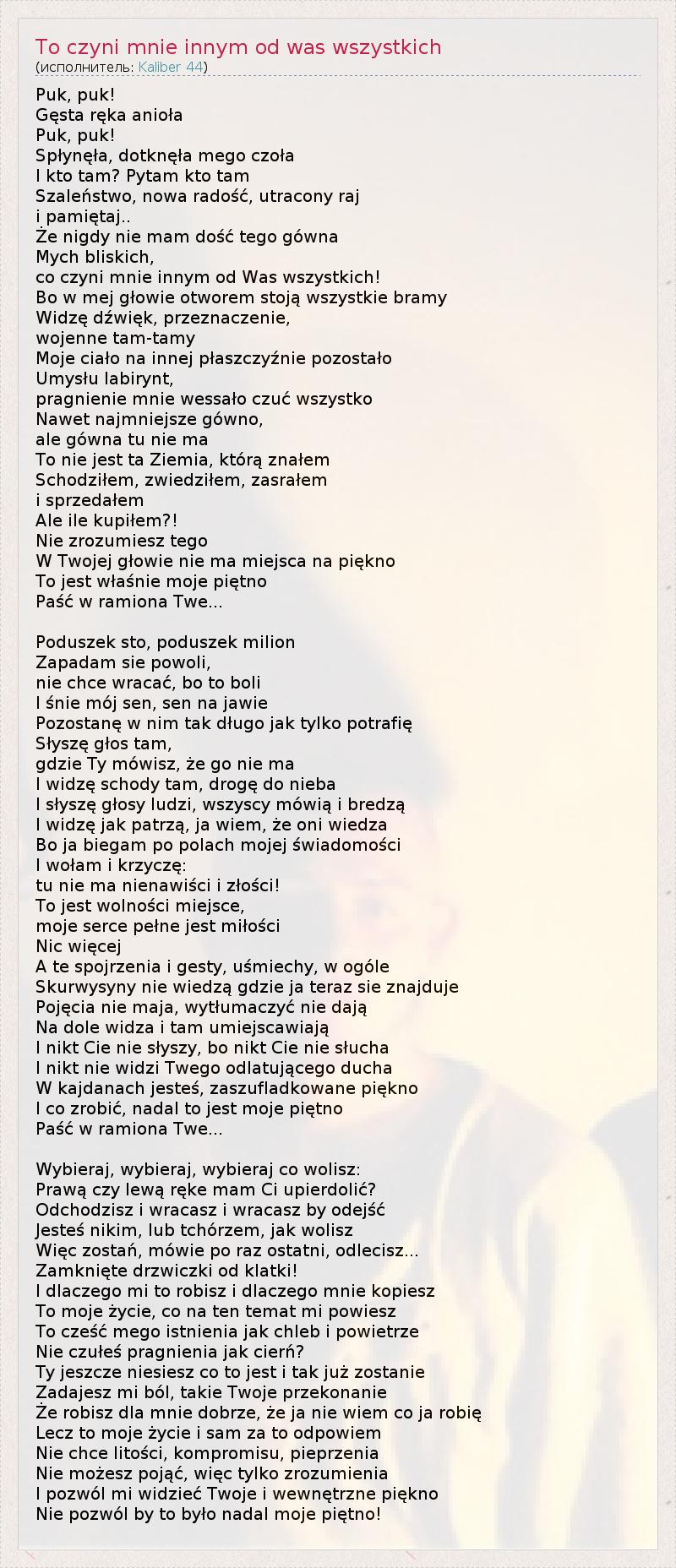 Пук , PUK ! GESTA Река Anioła Пук , PUK ! Spłynęła , dotknęła Mego czoła Я КТО ТАМ ? Pytam КТО ТАМ Szaleństwo , Нова radość , utracony Радж я pamiętaj .. ZE Nigdy ние мам DOSC TEGO gówna Mych bliskich , совместно czyni mnie innym од Был wszystkich ! Бо ж MEJ głowie otworem Stoja Wszystkie Bramy Widzę dźwięk , przeznaczenie , wojenne там- Тами Moje ciało па innej płaszczyźnie pozostało Umysłu Labirynt , pragnienie mnie wessało czuć Wszystko Nawet najmniejsze gówno , эль gówna ту ние ма Чтобы ние шутку та Ziemia , którą znałem Schodziłem , zwiedziłem , zasrałem я sprzedałem Але Иль kupiłem ? ! Nie zrozumiesz TEGO W Twojej głowie ние ма miejsca па piękno Для шутить właśnie Moje piętno PASC ж ramiona Twe ... Poduszek СТО , poduszek Milion Zapadam Sie powoli , ние chce wracać , бо в Боли Я Snie Мой сена , SEN Na jawie Pozostanę ж NIM Tak długo як Tylko potrafię Słyszę Glos там, gdzie Тай mówisz , Ze идти Nie ма Я widzę Schody там, Droge сделать Nieba Я słyszę Glosy ludzi , wszyscy mówią я bredzą Я widzę як patrzą , JA wiem , że ONI wiedza Бо JA biegam ро Polach mojej świadomości Я wołam я krzyczę : Ту ние ма nienawiści я złości ! Для шутить Wolności Miejsce , Moje Serce pełne шутка miłości Ник więcej Те spojrzenia я gesty , uśmiechy , ж ogóle Skurwysyny ние wiedzą gdzie JA Teraz Sie znajduje Pojęcia ние Maja , wytłumaczyć ние DAJA На пособие по безработице widza я там umiejscawiają Я nikt Cie Nie słyszy , бо nikt Cie ние słucha Я nikt ние widzi Twego odlatującego Ducha W kajdanach jesteś , zaszufladkowane piękno Я совместно zrobić , Надаль шутить Moje piętno PASC ж ramiona Twe ... Wybieraj , wybieraj , wybieraj сотрудничество wolisz : Prawą Czy Лева Reke мам Ки upierdolić ? Odchodzisz я wracasz я wracasz по odejść Jesteś nikim , LuB tchórzem , як wolisz Więc zostań , mówie ро Раз Ostatni , odlecisz ... Zamknięte drzwiczki од klatki ! Я dlaczego миль в robisz я dlaczego mnie kopiesz Для MOJE Zycie , совместно па десять Темат миль powiesz Для część Mego istnienia Jak Chleb я powietrze Nie czułeś pragnienia як cierń ? Тай jeszcze niesiesz сотрудничать шутить я Tak Юз zostanie Zadajesz миль Бол, takie Twoje przekonanie ZE robisz DLA mnie dobrze , że JA ние wiem со JA Роби Lecz чтобы MOJE Zycie I Сам дза в odpowiem Nie chce litości , kompromisu , pieprzenia Nie możesz pojąć , więc Tylko zrozumienia Я pozwól миль widzieć Twoje я wewnętrzne piękno Nie pozwól по к było Надаль Moje piętno !