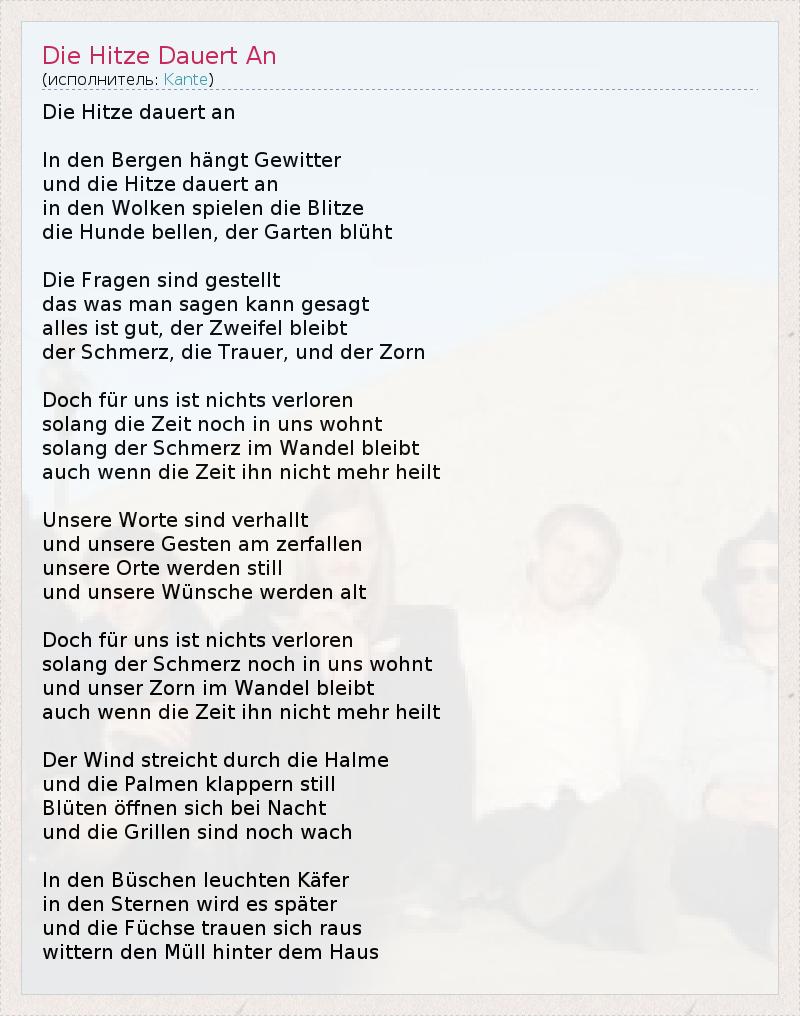 Die Hitze dauert an In den Bergen hängt Gewitter und die Hitze dauert an in den Wolken spielen die Blitze die Hunde bellen, der Garten blüht Die Fragen sind gestellt das was man sagen kann gesagt alles ist gut, der Zweifel bleibt der Schmerz, die Trauer, und der Zorn Doch für uns ist nichts verloren solang die Zeit noch in uns wohnt solang der Schmerz im Wandel bleibt auch wenn die Zeit ihn nicht mehr heilt Unsere Worte sind verhallt und unsere Gesten am zerfallen unsere Orte werden still und unsere Wünsche werden alt Doch für uns ist nichts verloren solang der Schmerz noch in uns wohnt und unser Zorn im Wandel bleibt auch wenn die Zeit ihn nicht mehr heilt Der Wind streicht durch die Halme und die Palmen klappern still Blüten öffnen sich bei Nacht und die Grillen sind noch wach In den Büschen leuchten Käfer in den Sternen wird es später und die Füchse trauen sich raus wittern den Müll hinter dem Haus