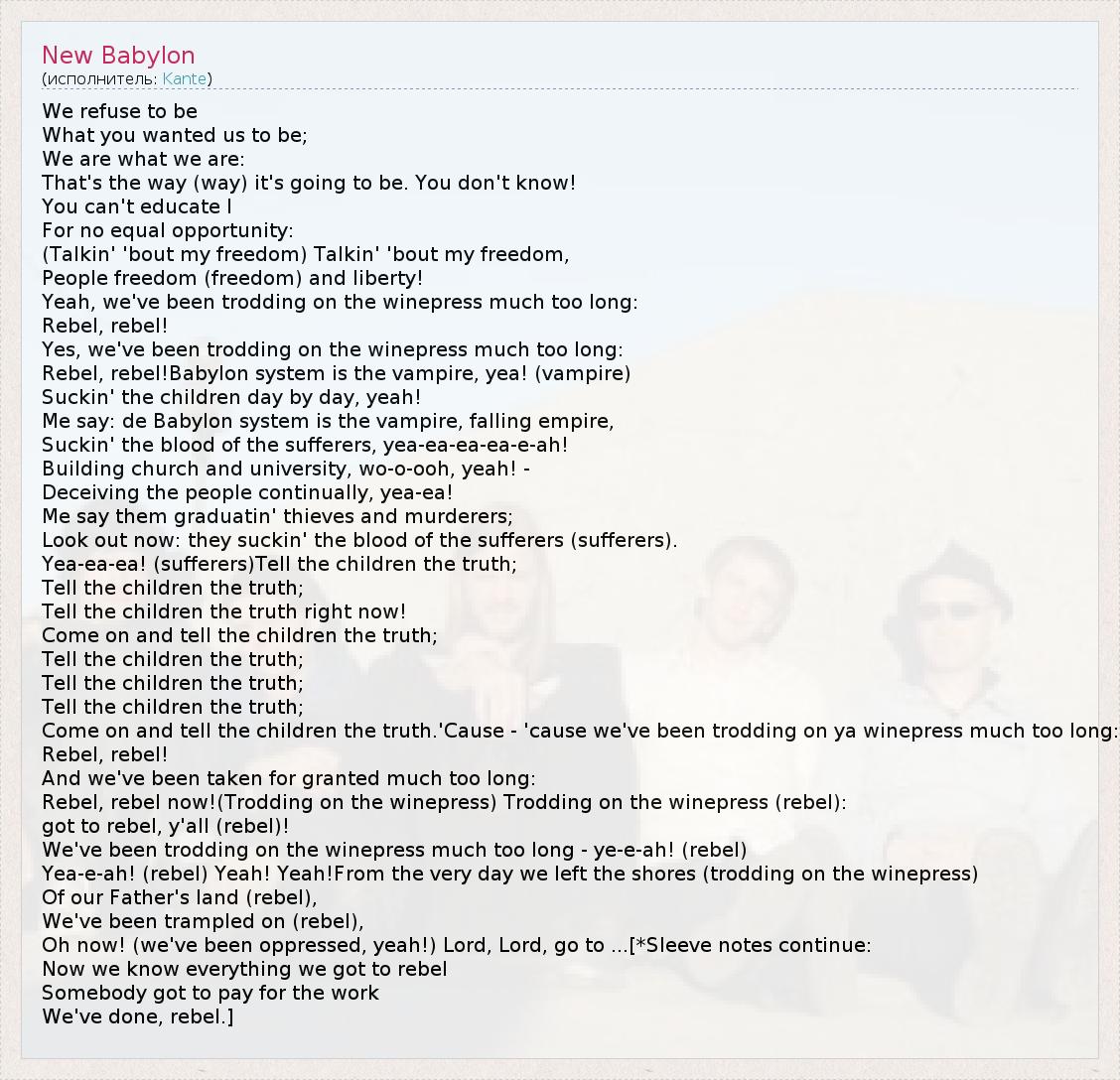 We refuse to be What you wanted us to be; We are what we are: That's the way (way) it's going to be. You don't know! You can't educate I For no equal opportunity: (Talkin' 'bout my freedom) Talkin' 'bout my freedom, People freedom (freedom) and liberty! Yeah, we've been trodding on the winepress much too long: Rebel, rebel! Yes, we've been trodding on the winepress much too long: Rebel, rebel!Babylon system is the vampire, yea! (vampire) Suckin' the children day by day, yeah! Me say: de Babylon system is the vampire, falling empire, Suckin' the blood of the sufferers, yea-ea-ea-ea-e-ah! Building church and university, wo-o-ooh, yeah! - Deceiving the people continually, yea-ea! Me say them graduatin' thieves and murderers; Look out now: they suckin' the blood of the sufferers (sufferers). Yea-ea-ea! (sufferers)Tell the children the truth; Tell the children the truth; Tell the children the truth right now! Come on and tell the children the truth; Tell the children the truth; Tell the children the truth; Tell the children the truth; Come on and tell the children the truth.'Cause - 'cause we've been trodding on ya winepress much too long: Rebel, rebel! And we've been taken for granted much too long: Rebel, rebel now!(Trodding on the winepress) Trodding on the winepress (rebel): got to rebel, y'all (rebel)! We've been trodding on the winepress much too long - ye-e-ah! (rebel) Yea-e-ah! (rebel) Yeah! Yeah!From the very day we left the shores (trodding on the winepress) Of our Father's land (rebel), We've been trampled on (rebel), Oh now! (we've been oppressed, yeah!) Lord, Lord, go to ...[*Sleeve notes continue: Now we know everything we got to rebel Somebody got to pay for the work We've done, rebel.]