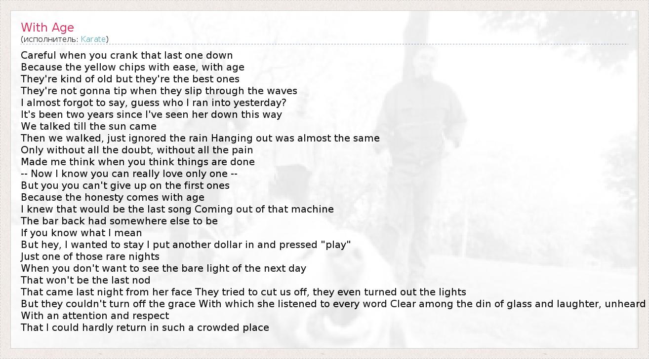Careful when you crank that last one down Because the yellow chips with ease, with age They're kind of old but they're the best ones They're not gonna tip when they slip through the waves I almost forgot to say, guess who I ran into yesterday? It's been two years since I've seen her down this way We talked till the sun came Then we walked, just ignored the rain Hanging out was almost the same Only without all the doubt, without all the pain Made me think when you think things are done -- Now I know you can really love only one -- But you you can't give up on the first ones Because the honesty comes with age I knew that would be the last song Coming out of that machine The bar back had somewhere else to be If you know what I mean But hey, I wanted to stay I put another dollar in and pressed "play" Just one of those rare nights When you don't want to see the bare light of the next day That won't be the last nod That came last night from her face They tried to cut us off, they even turned out the lights But they couldn't turn off the grace With which she listened to every word Clear among the din of glass and laughter, unheard With an attention and respect That I could hardly return in such a crowded place